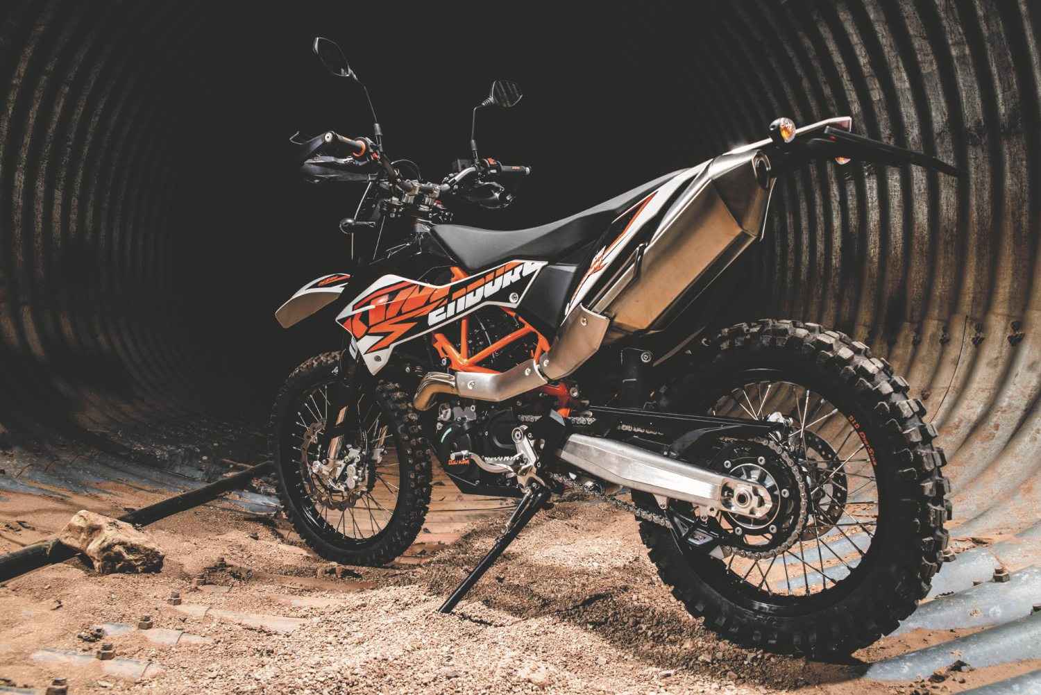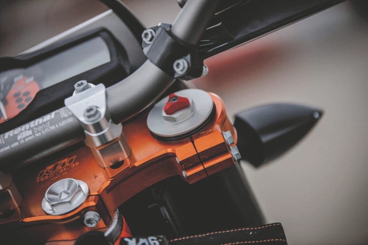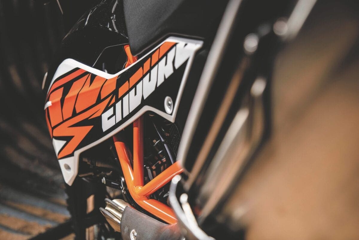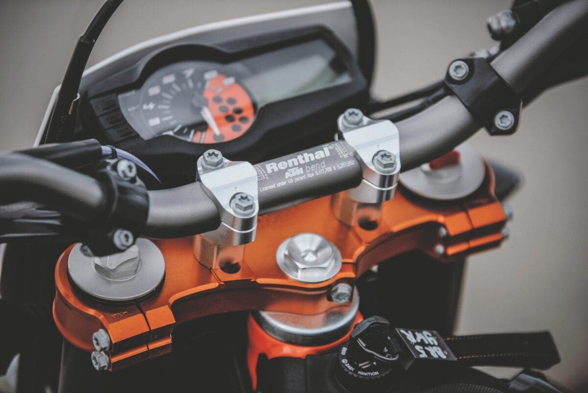 In their different ways the KTMs are both classy looking bikes, their many neat touches including the orange-finished chrome molybdenum steel frame tubes. Both feel pretty serious when you climb aboard a long, thin and not very comfortable single seat that’s a dizzying height off the ground — the Enduro’s higher by 20mm, at 910mm. At least the long-travel suspension compresses enough to allow average height riders to get a foot down, just about. And at under 145kg they’re light enough to be manageable as soon as you pull away.