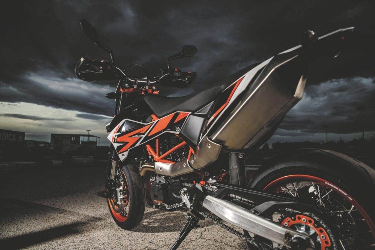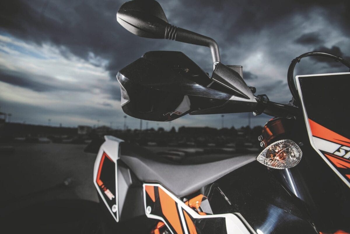 For solely road-going use the SMC R is the better option, though the more conventional 690 Duke (or better still the upmarket 690 Duke R) would be a more practical alternative still. On the open road the SMC R cruised along quite smoothly at 70mph, and rumbled up to about 110mph, feeling faster due to some vibes coming through the wide, one-piece Renthal handlebar, and to my inability to hide behind the tiny headlamp surround.
