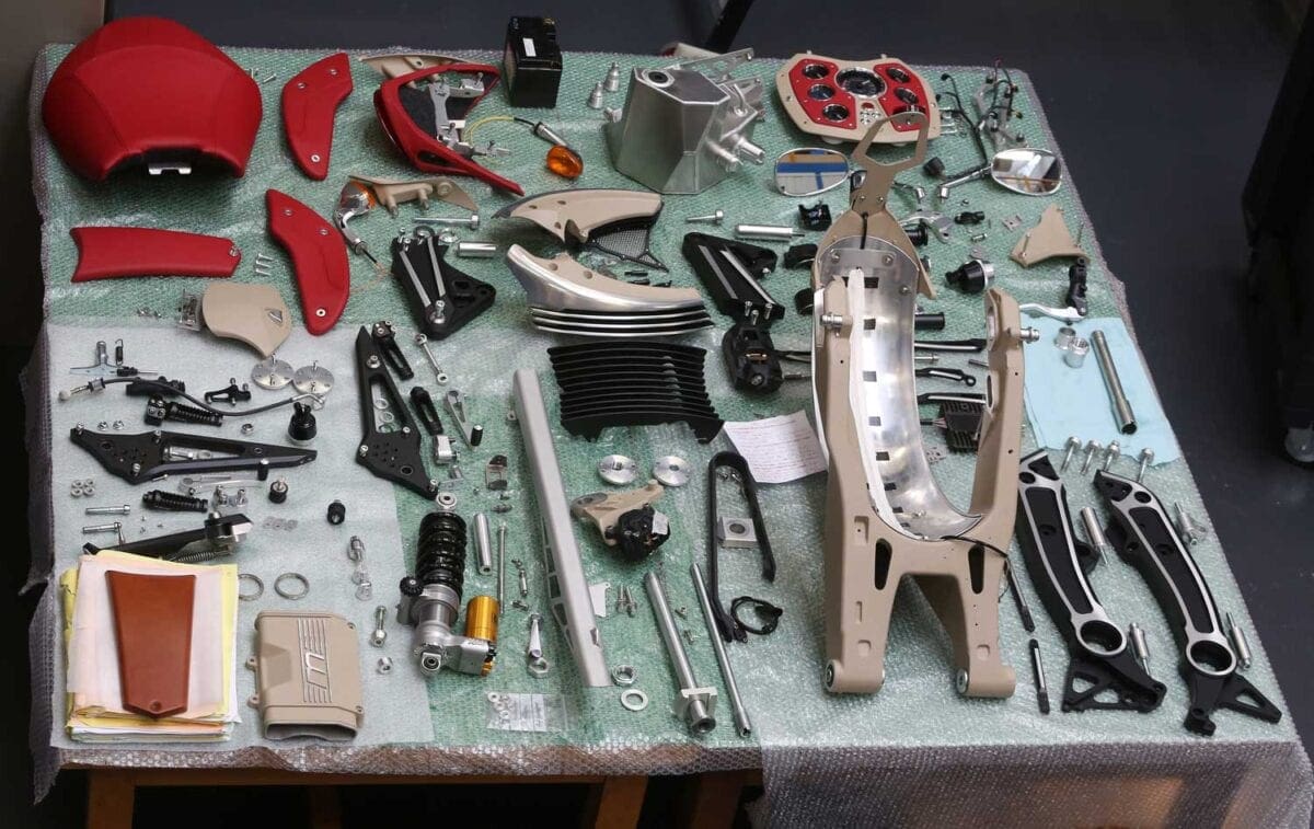 An immensely stiff cast aluminium double-wall monocoque frame sourced from an 84kg raw casting which has been five-axis machined and manually polished down to the finished product weighing 24kg. It’s the subject of two further patents and 7000 hours of development work that takes hundreds of hours to craft. It incorporates the integral 14-litre fuel tank, so it’s a true monocoque.