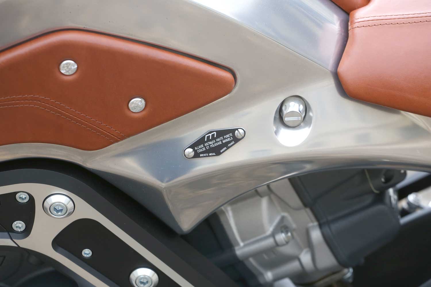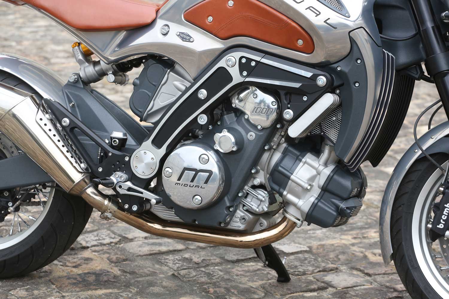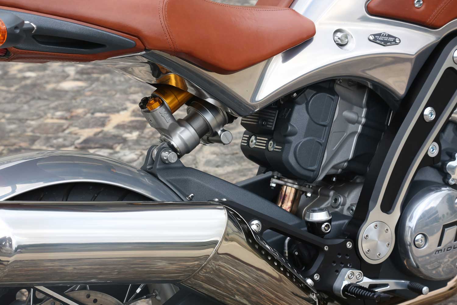 All 520 component parts were designed by Midy himself. The 1036cc Midual engine is a Dual Over Head Cam eight-valve flat-twin with vertically-split crankcases, whose cylinders being tilted forward by 25º provide space for the six-speed transmission to be mounted beneath the rear pot, combined with an oil-bath ramp-style slipper clutch, and straight-cut primary gears. Midy holds five global patents relating to its design and it accounts for 15,000 hours of collective work by Midual’s eight-person team – including his wife and brother.