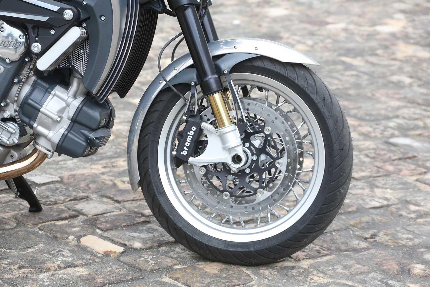 The 17-inch Akront aluminium wire-wheel rims (cast wheels are one of the many options – each bike is essentially built to order) carry Michelin Pilot Road 2 tyres. The design of the Spanish rims mean there’s no need for inner tubes. Twin 320mm Brembo floating front discs are gripped by four-piston four-pad Brembo Monobloc radial calipers, while there’s a fixed 245mm rear disc with two-piston caliper.