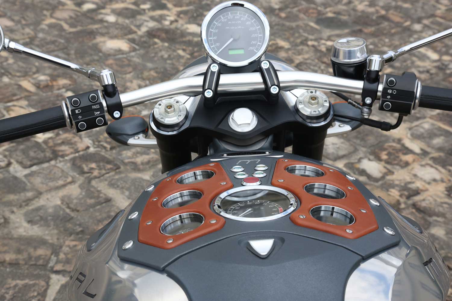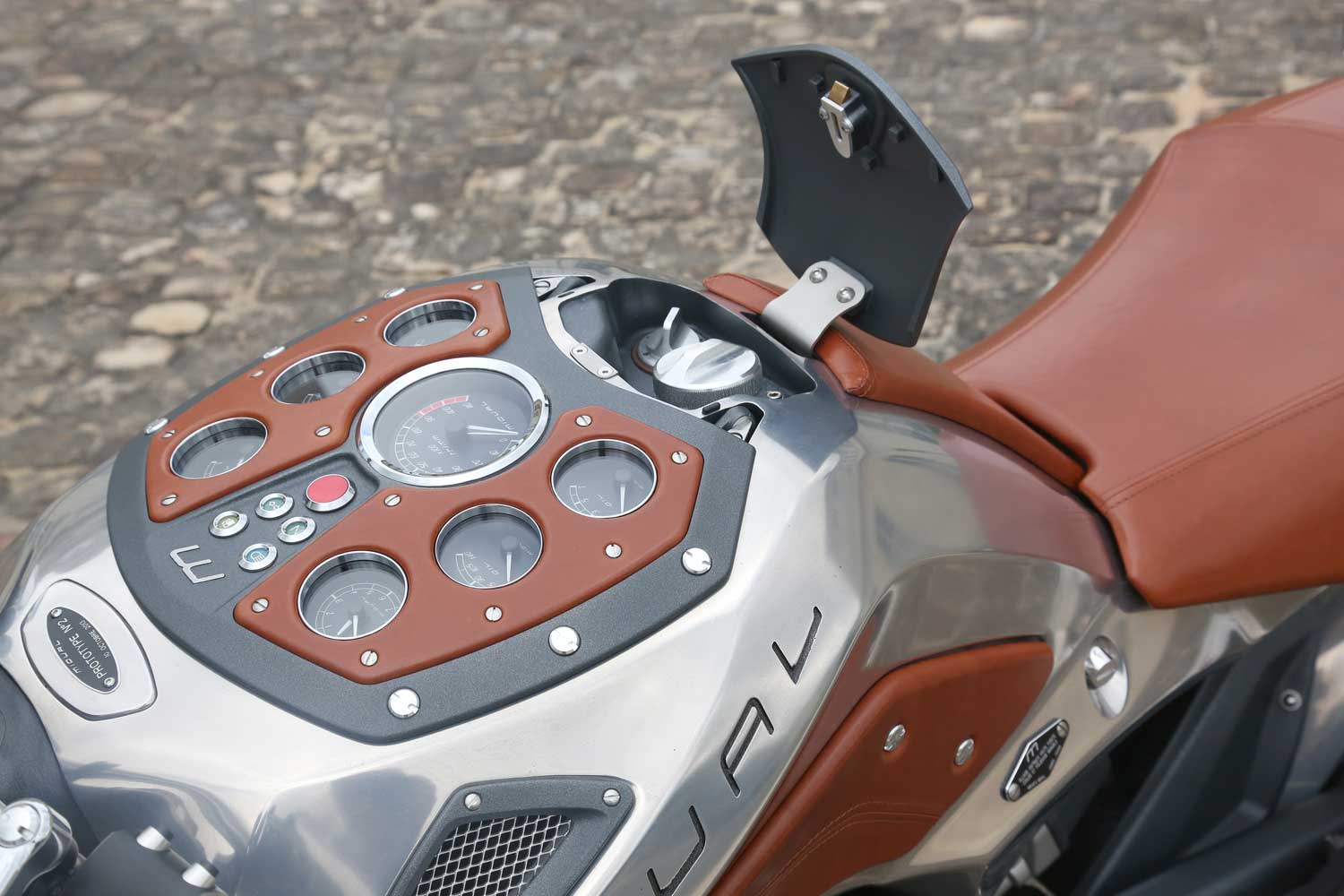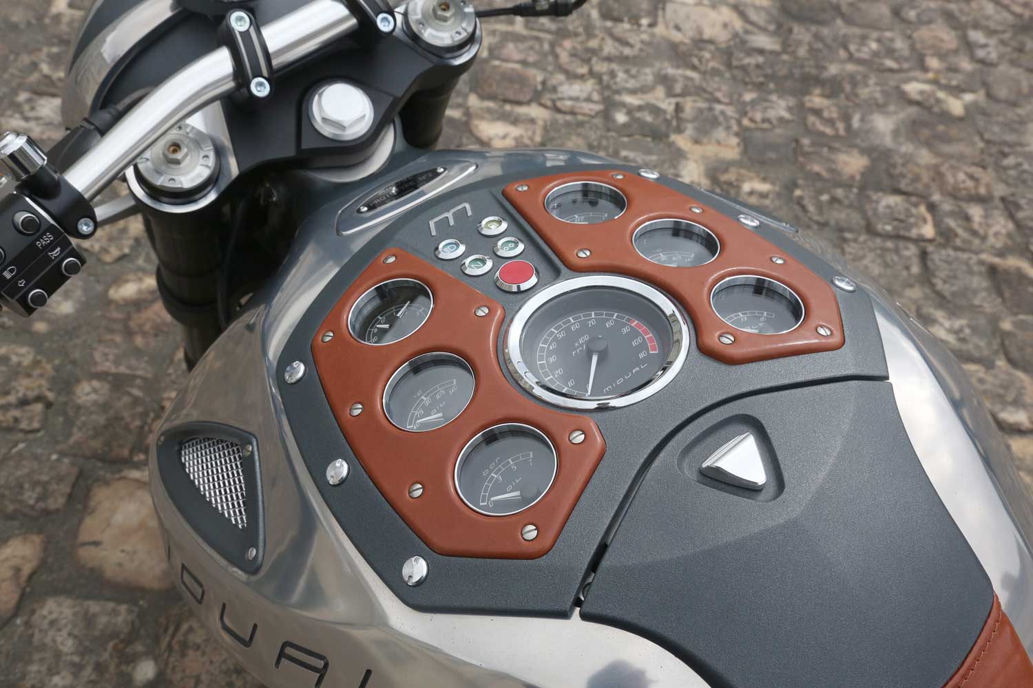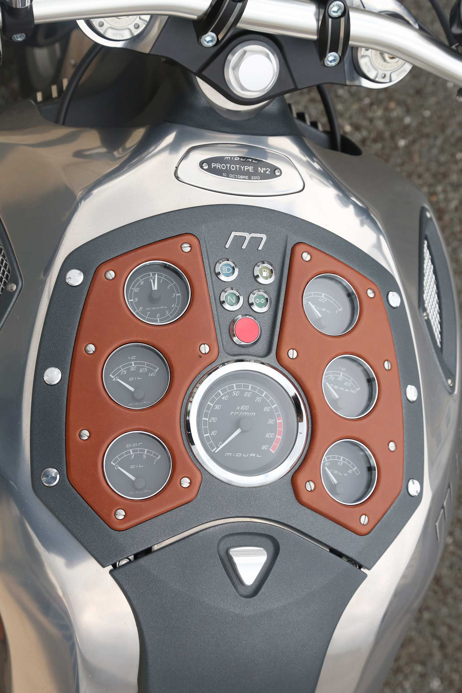 The speedometer is in front of the one-piece taper-section handlebar mounted on 35mm risers which is made right next door to the Midual factory in Angers, by Neken, who make handlebars for BMW too. All other components of the dashboard are mounted in the upper face of the monocoque chassis, with the large tacho flanked by six smaller round dials, three each side – a clock, oil temp and oil pressure gauges on the left, and fuel, water temp and voltmeter on the right, with a quartet of warning lights in the centre, above the large red starter button.