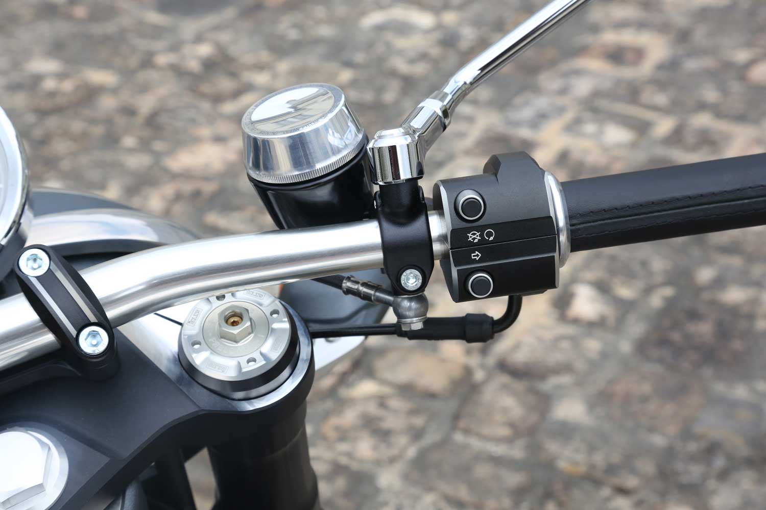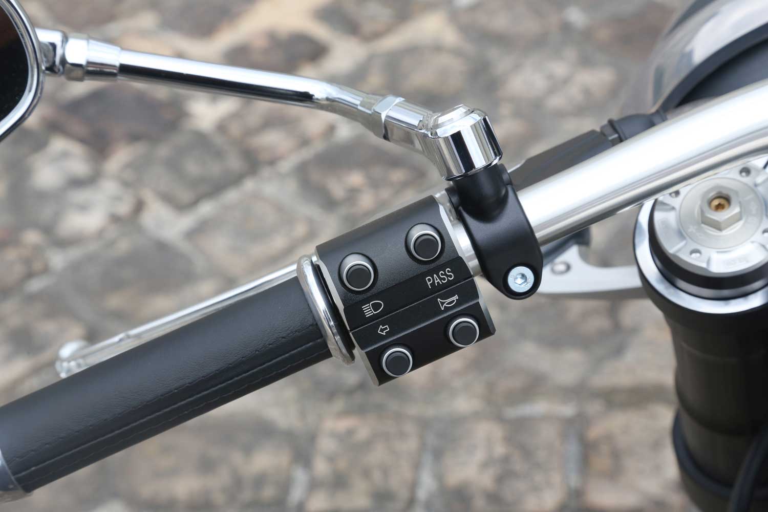 Both the handlebar-mounted metal control units are made in-house by Midual. Out of the 1,550 components in this entire bike, only one is plastic and that’s the numberplate. There are the old-style BMW indicator buttons so you must push the button on the right to turn right, then press it again to stop it flashing, and the same thing on the left to turn left. You wouldn’t guess that Midy has been riding BMW Boxer twins for the past 20 years, would you?
