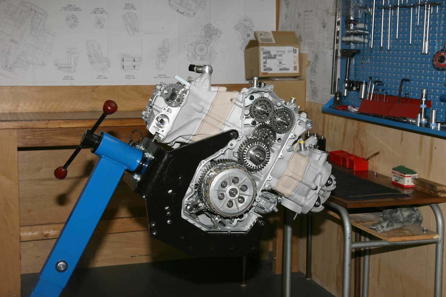 The one-piece 180-degree plain-bearing crankshaft runs on central plain main bearings and two outer ball bearings, with its steel conrods carrying three-ring forged pistons delivering a 12:1 compression ratio. A layshaft is mounted above the crank and driven directly off it, which in turn actuates the rear of the two high-pressure trochoidal oil pumps, whose pinion then drives its forward companion. That layshaft also drives the two camchains operating the twin overhead camshafts per cylinder, fitted with hydraulic tensioners. These operate the four valves per cylinder – twin 36mm inlets set at a 21.5º included angle to the 31mm exhausts – via cylindrical tappets.