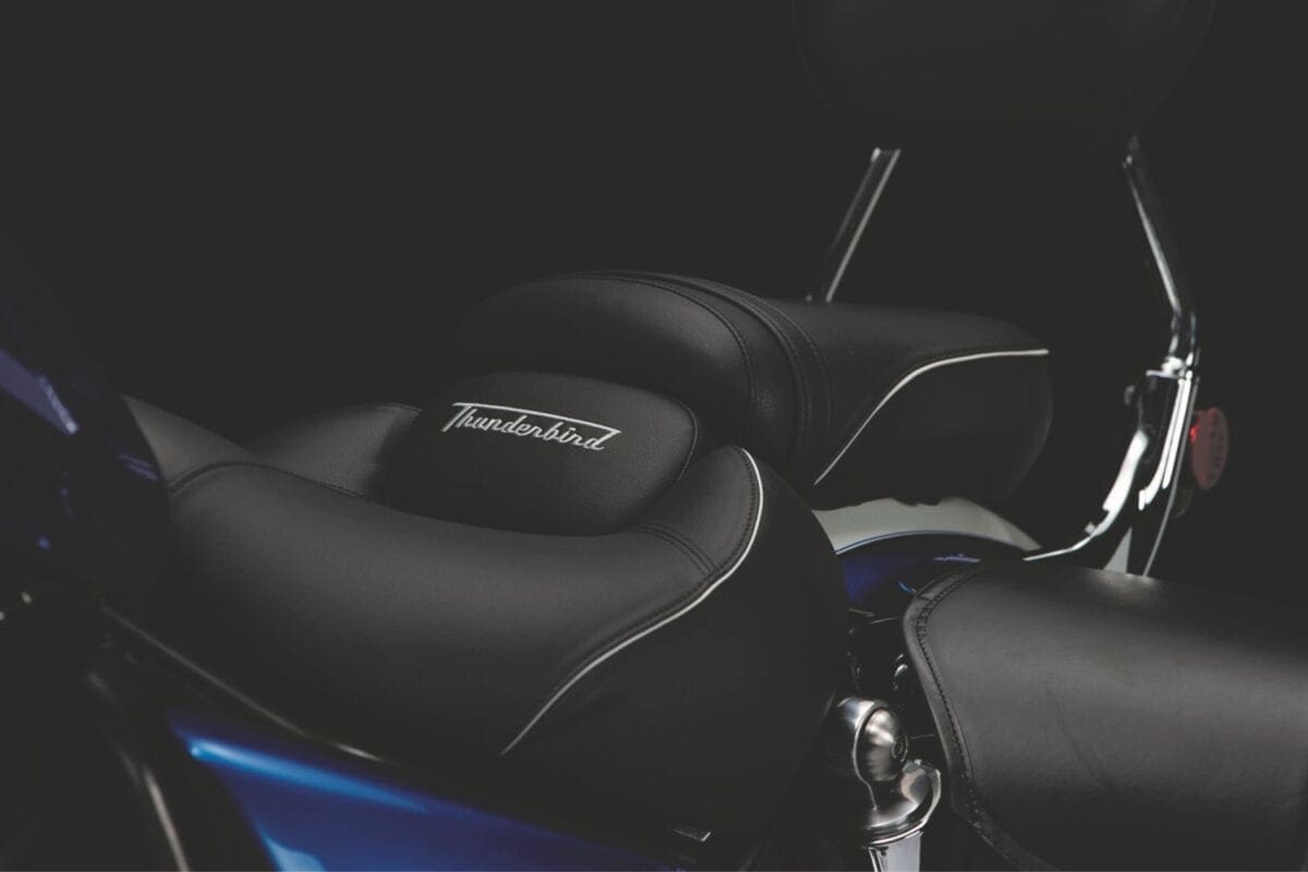 Triumph designed a stiffer, low-set tubular steel frame whose diagonally mounted shocks give 109mm of rear wheel travel, which is 14mm more than the basic T-bird’s, and generous by cruiser standards. The Showa units have dual-rate springs, with tighter windings (which compress more readily to absorb smaller bumps) hidden beneath the chromed shroud at their tops. Ride quality is also enhanced by the seat, which is thickly padded and incorporates a lumbar support pad comprising foam of three different densities.