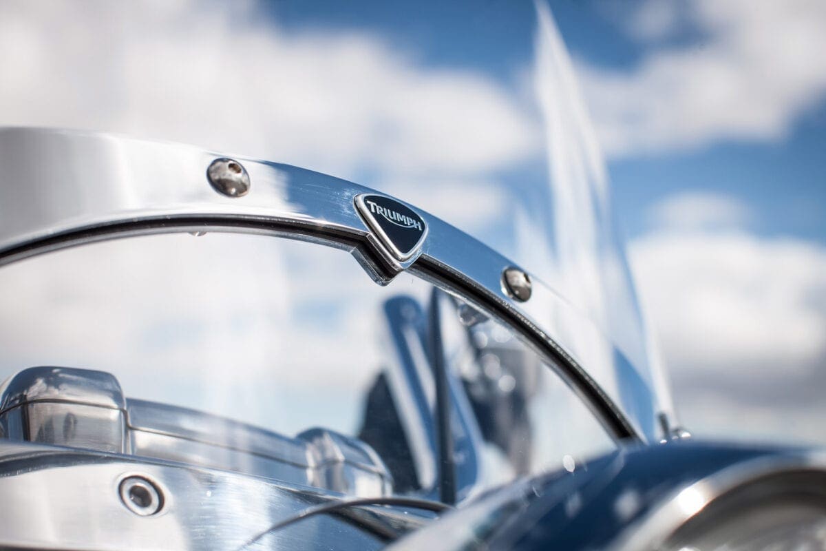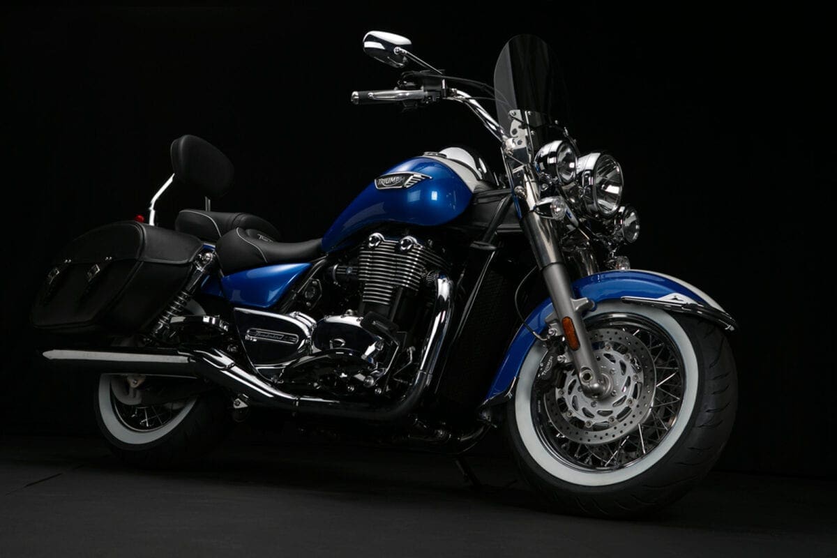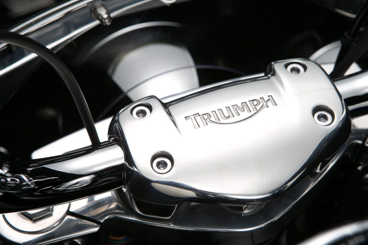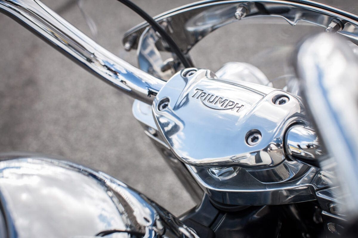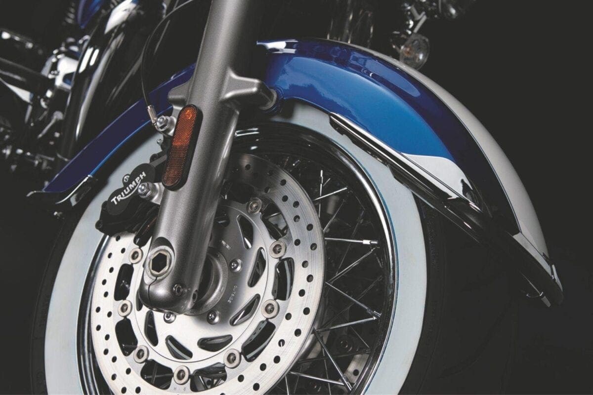 Triumph showed their commitment to the chassis when, after discovering that no tyre firm made white-wall radials, they teamed up with Avon to develop some fat 16-inchers that complement the twin’s thick two-tone paintwork very nicely.