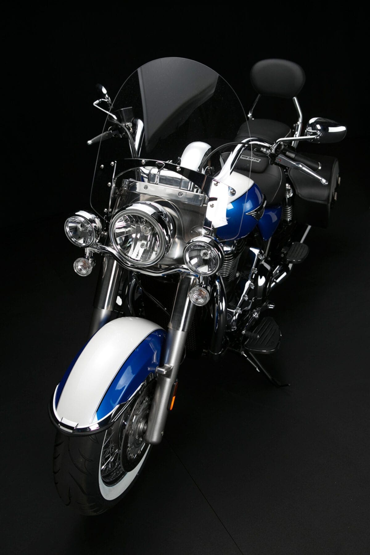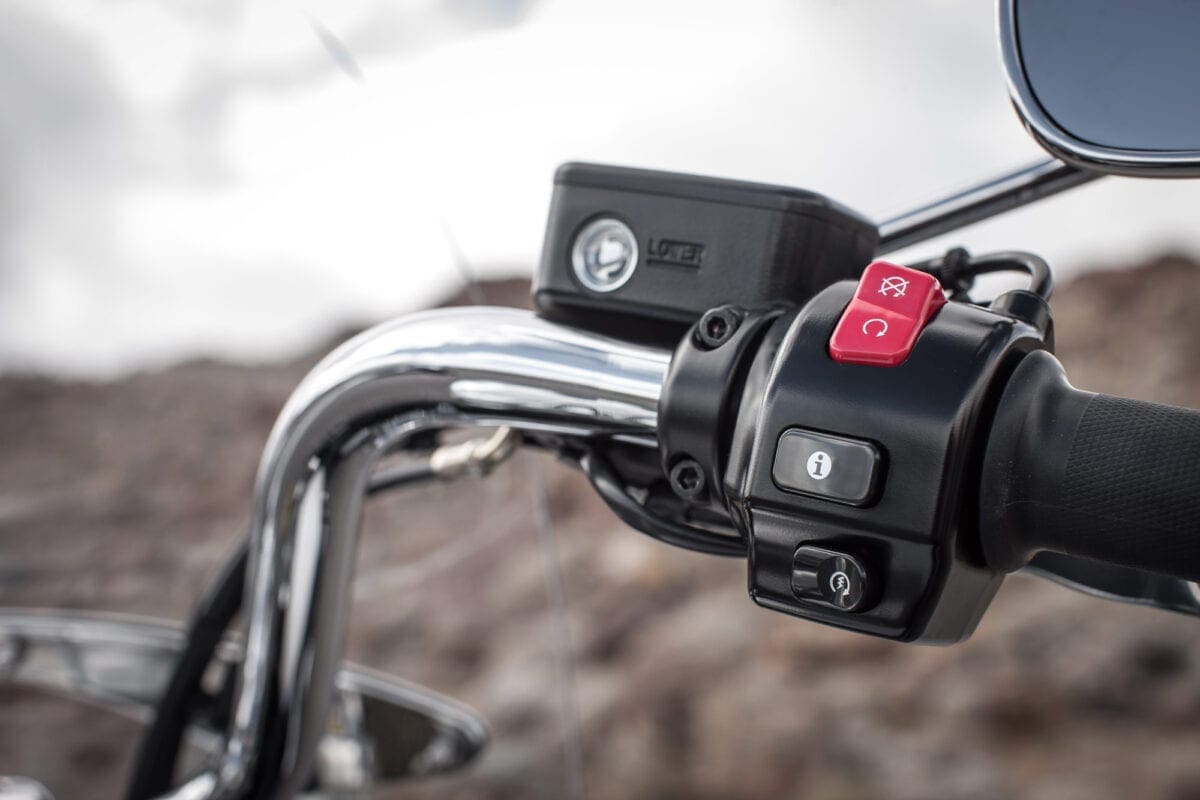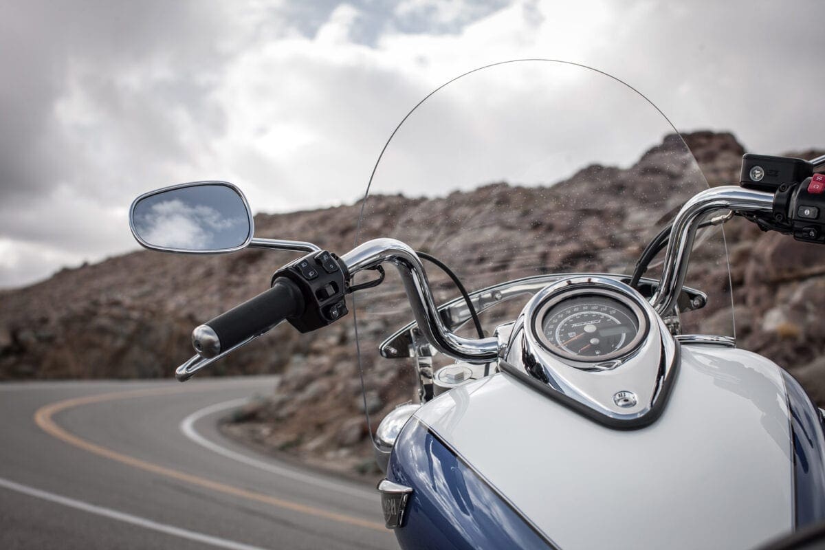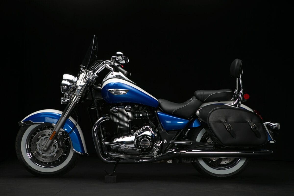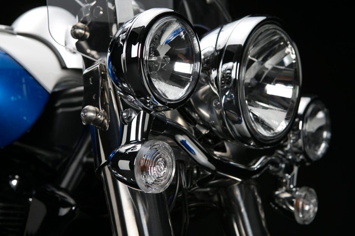 It’s also usefully versatile. Its screen unclips in seconds. The panniers, which incorporate inner bags and a 12V socket, unbolt easily complete with brackets, leaving a cleanly styled naked cruiser for short trips and fine weather. The long list of accessories includes highway pegs, crash-bars, luggage rack and numerous billet parts.
