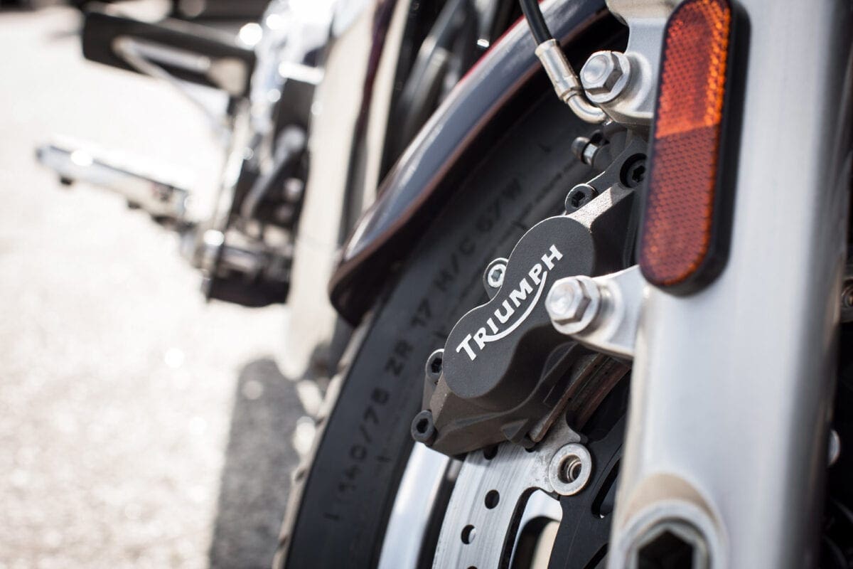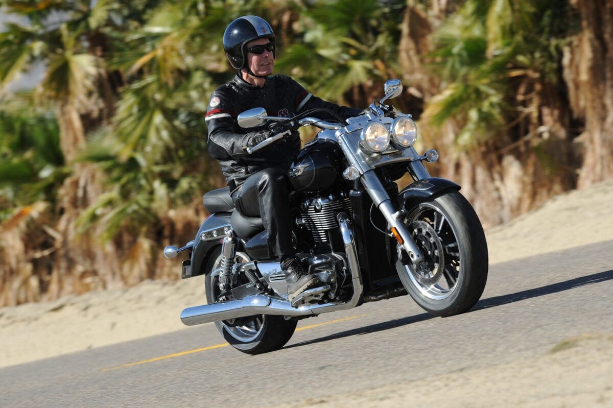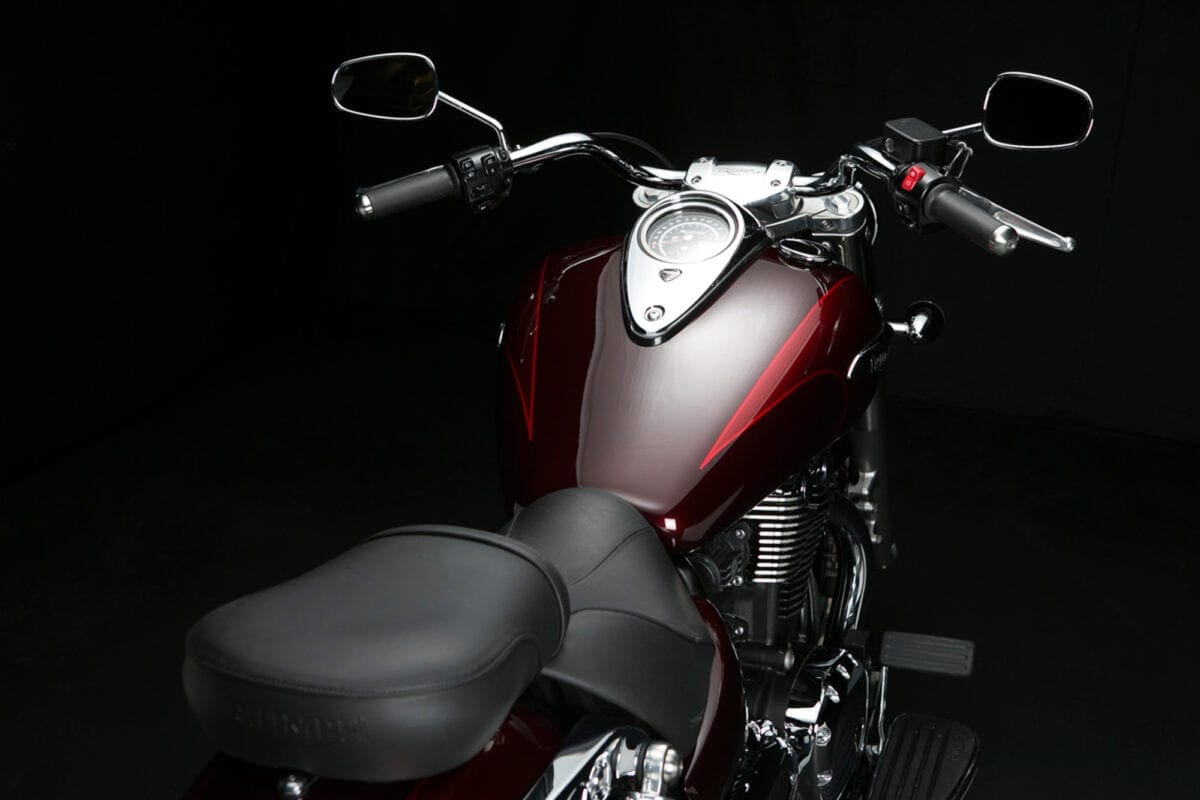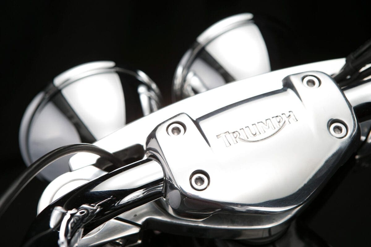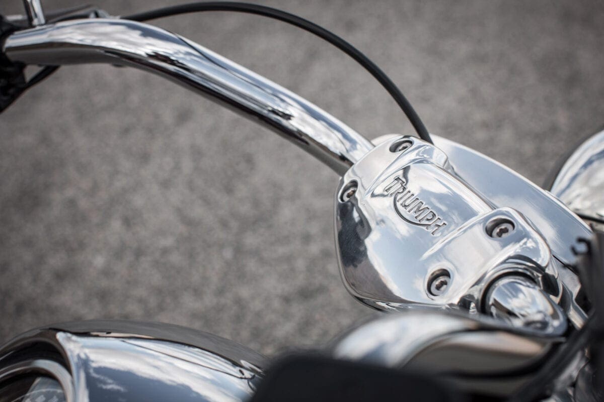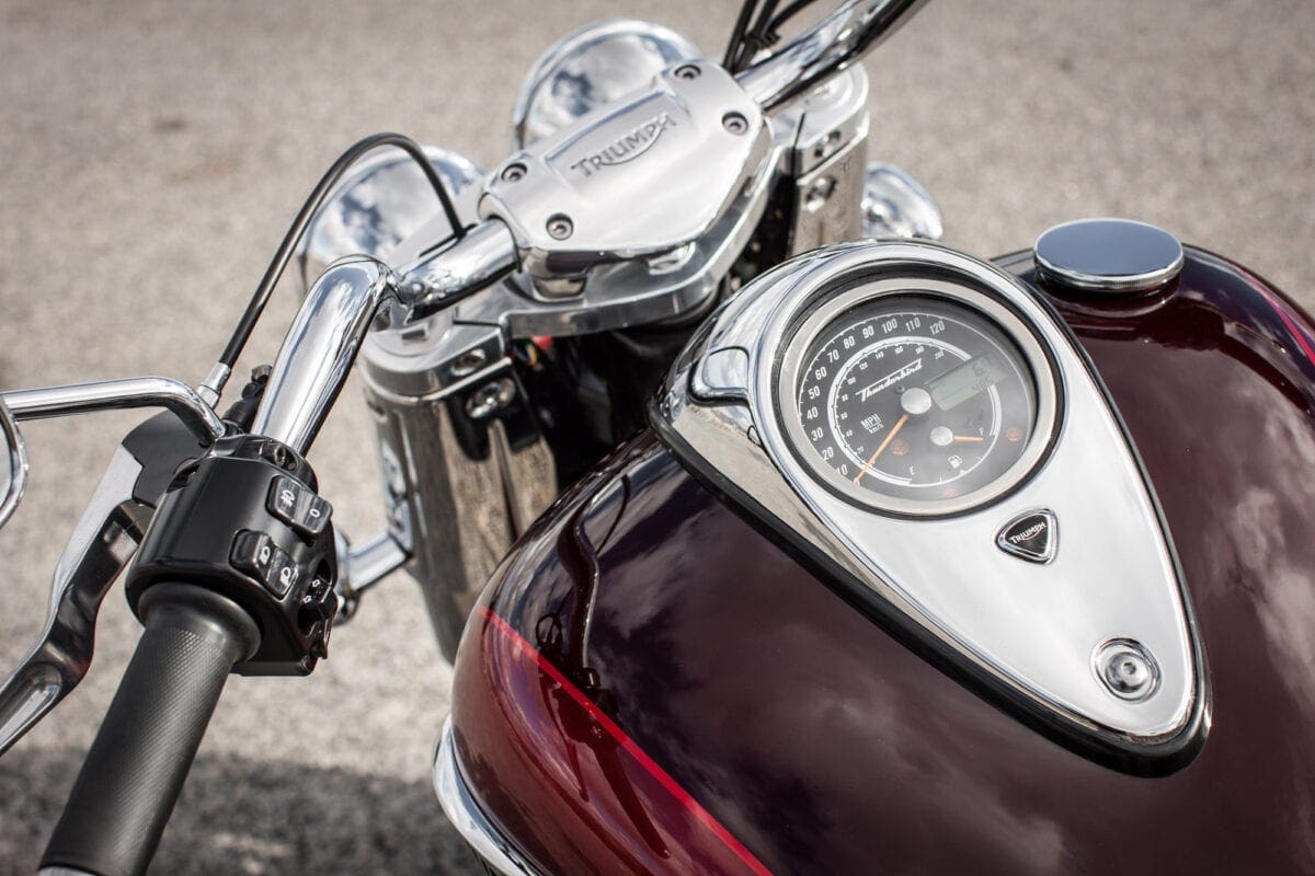 Tr_TbdCom_134Masses of low-rev grunt mean that you don’t have to lift your left boot from the footboard to use the perfectly good six-speed gearbox unless you particularly want to. The big Triumph responds to the throttle in an impressively instant, smooth and controllable way, thudding forward at an entertaining but never threatening rate until the tank-top speedo is showing three figures and you’re requiring a pretty tight grip on the slightly lower one-piece handlebar.
