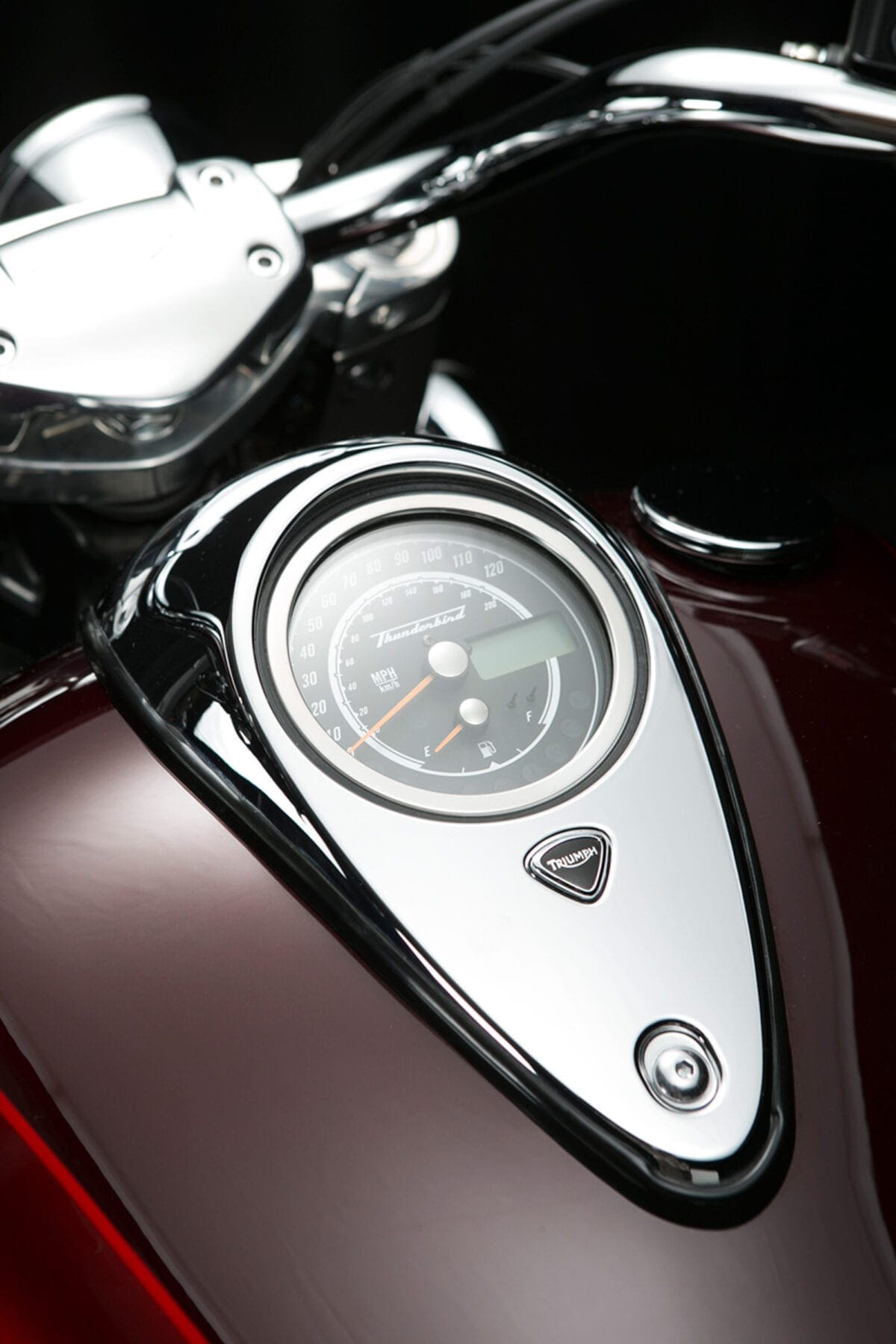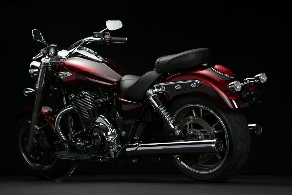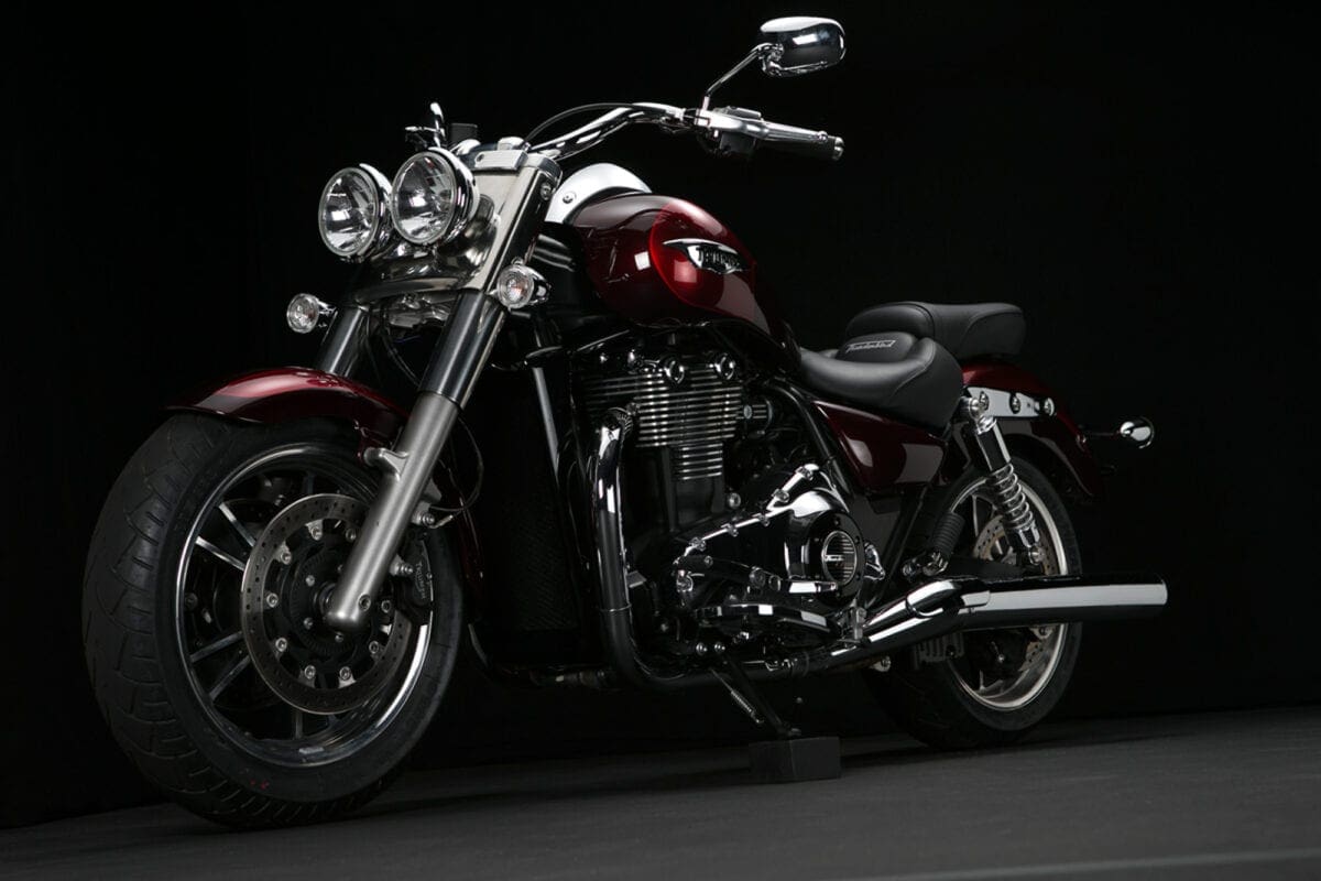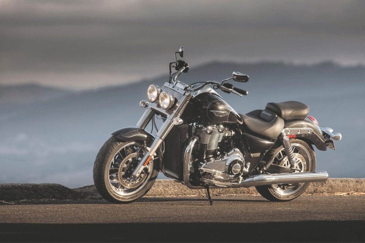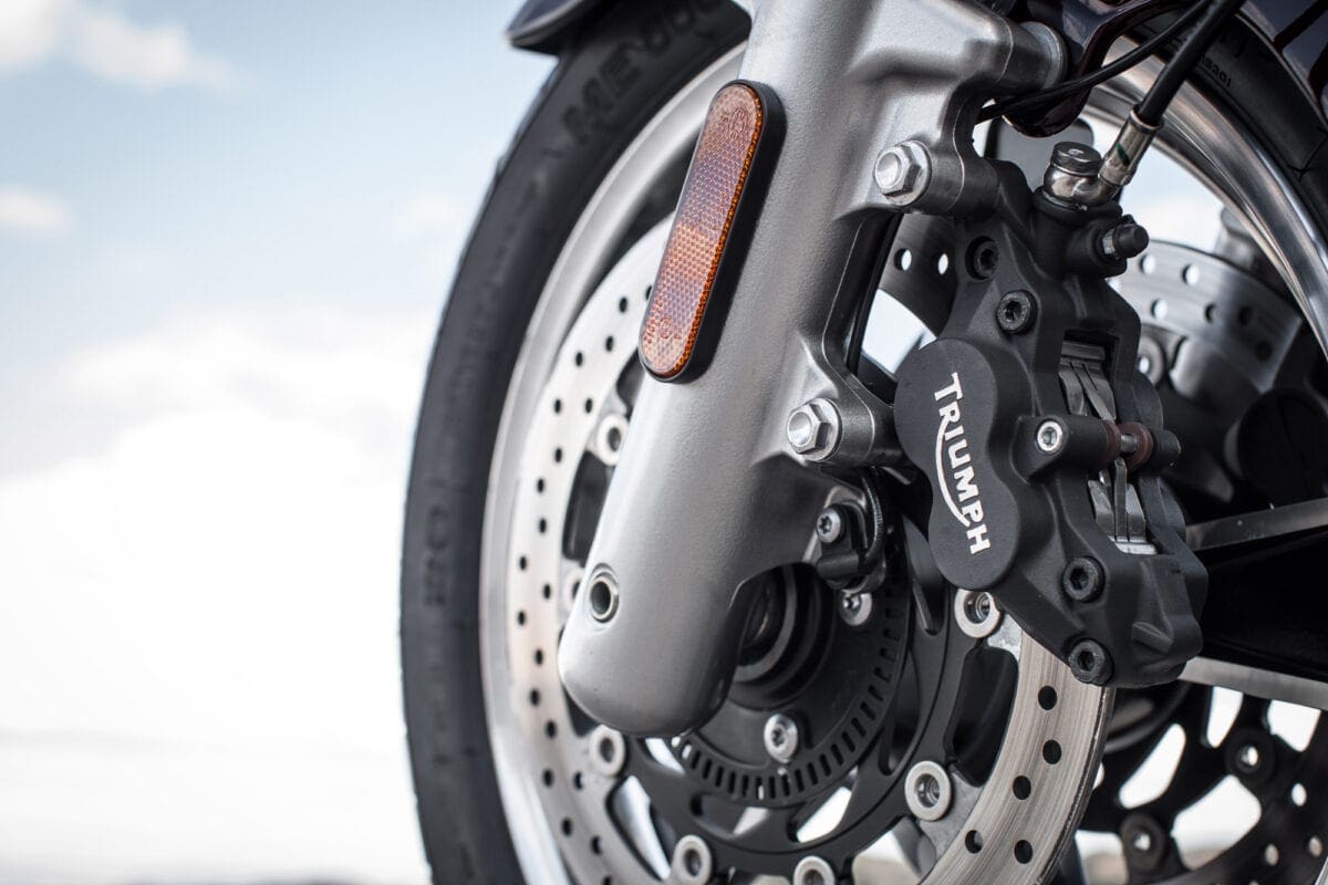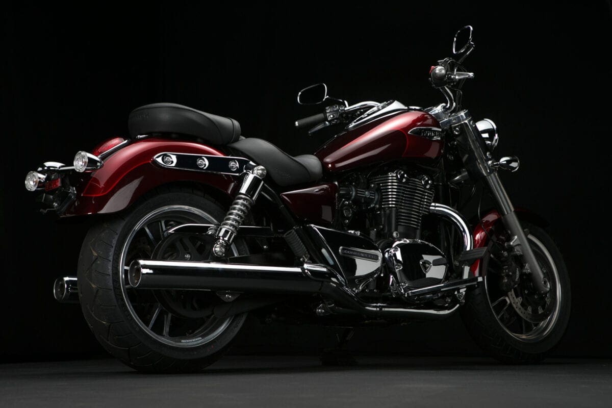 Tr_TbdCom_134Masses of low-rev grunt mean that you don’t have to lift your left boot from the footboard to use the perfectly good six-speed gearbox unless you particularly want to. The big Triumph responds to the throttle in an impressively instant, smooth and controllable way, thudding forward at an entertaining but never threatening rate until the tank-top speedo is showing three figures and you’re requiring a pretty tight grip on the slightly lower one-piece handlebar.