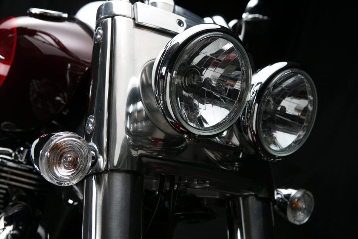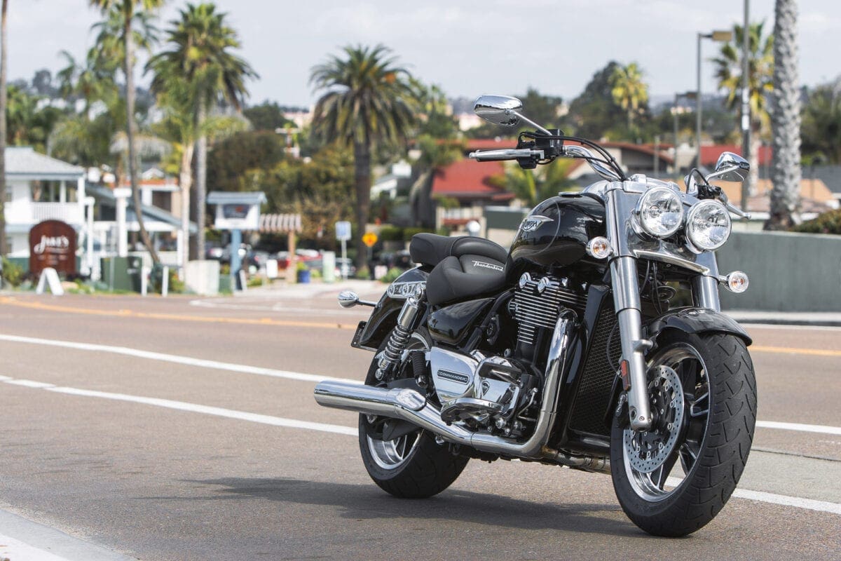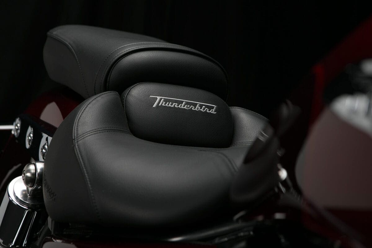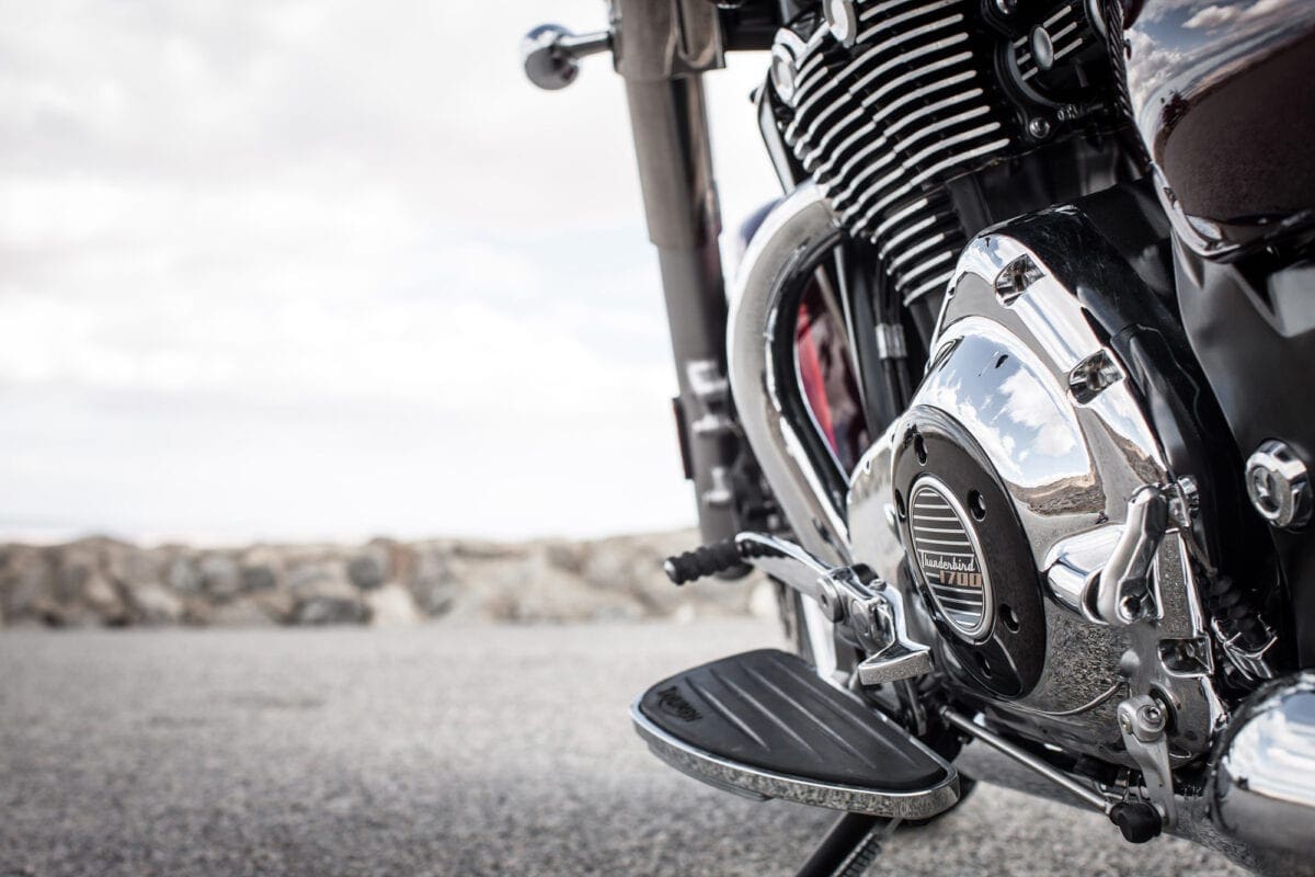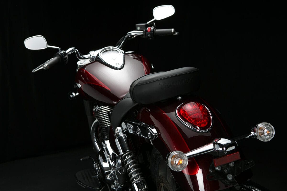 If you just glance at the T-bird Commander’s shape and shiny twin-headlight grin, there doesn’t seem to be much difference between this latest mean-and-moody parallel twin and the Thunderbird Storm with which Triumph gave its cruiser line an extra dollop of menace back in 2011. Dig deeper though, and the Commander is very different – much more like the LT with which it shares the majority of both engine and chassis components. That 1699cc parallel twin engine is common to all three models, but the airbox and exhaust system that detune it slightly to a max of 93bhp, while adding a bit more noise, are like those of the LT. The Commander also shares the Light Tourer’s chassis with its revamped frame, dual-rate shock springs and thicker seat.