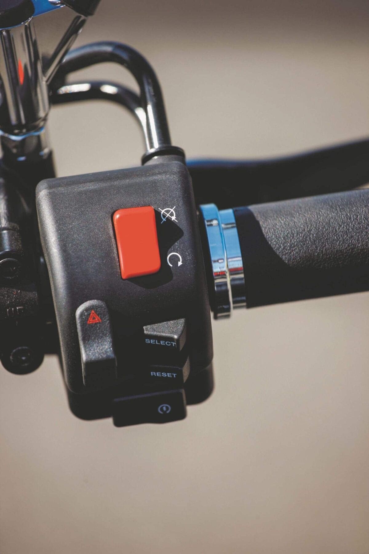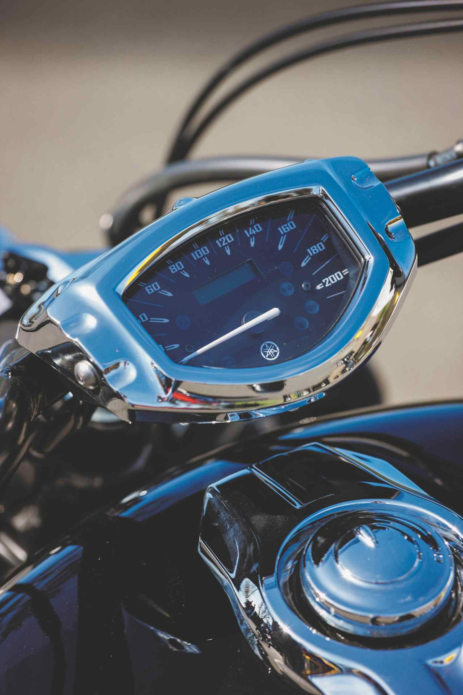 020_ClocksThe V-twin XVS motor might look like an air-cooled antique, but there’s a radiator nestling between the frame rails. What you don’t see is the liquid-cooling plumbing – carefully concealed under panels and petrol tank. Or the twin balancer shafts that reduce vibration. Or the ceramic cylinder bores and digital fuel injection. These are the things that civilise the experience. High speed cruising without the tingles is a welcome change, immaculate fuelling at all rpms is another. 21st century engine tuning is no longer about more power and damn the flexibility: These days the watchword is ease-of use.