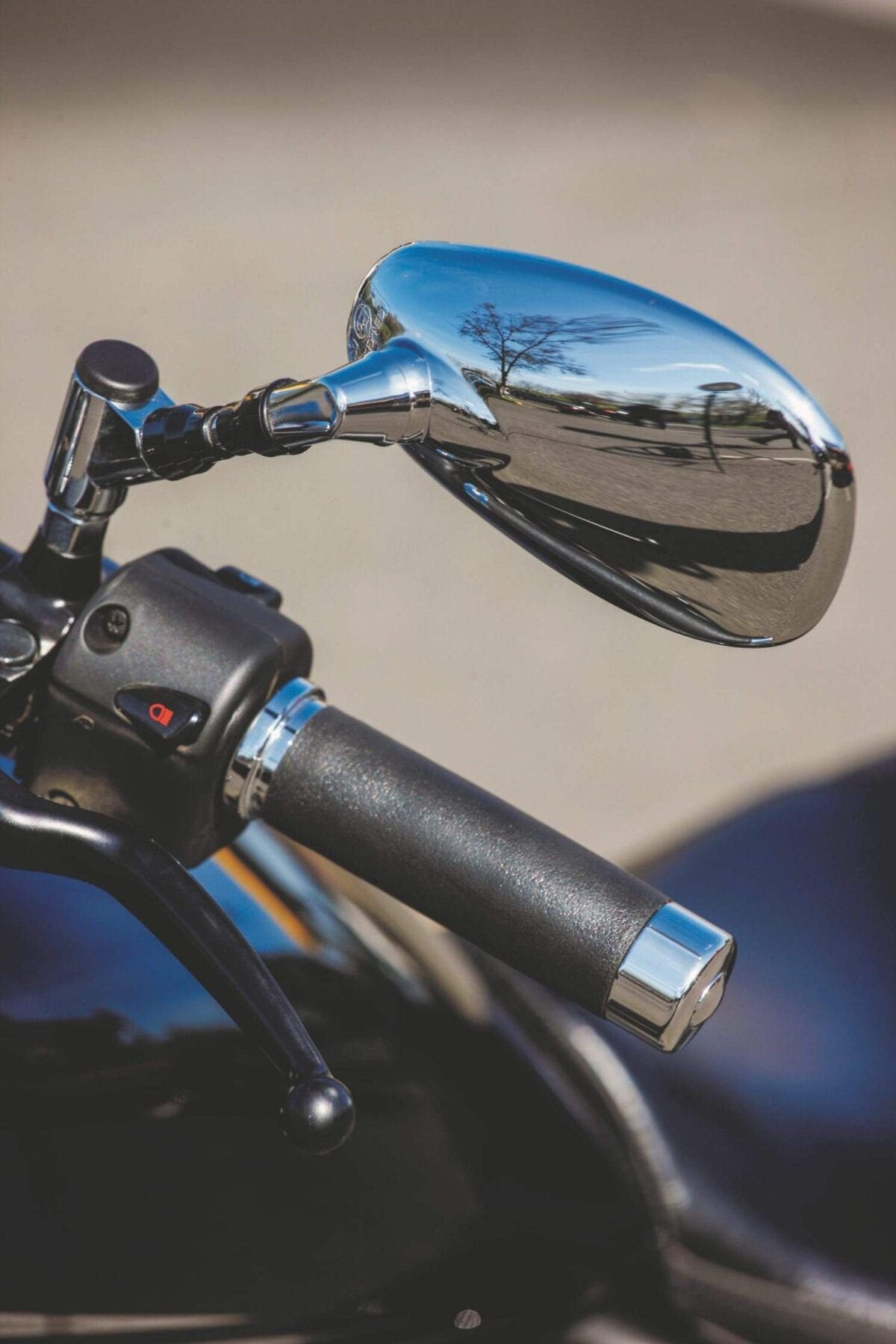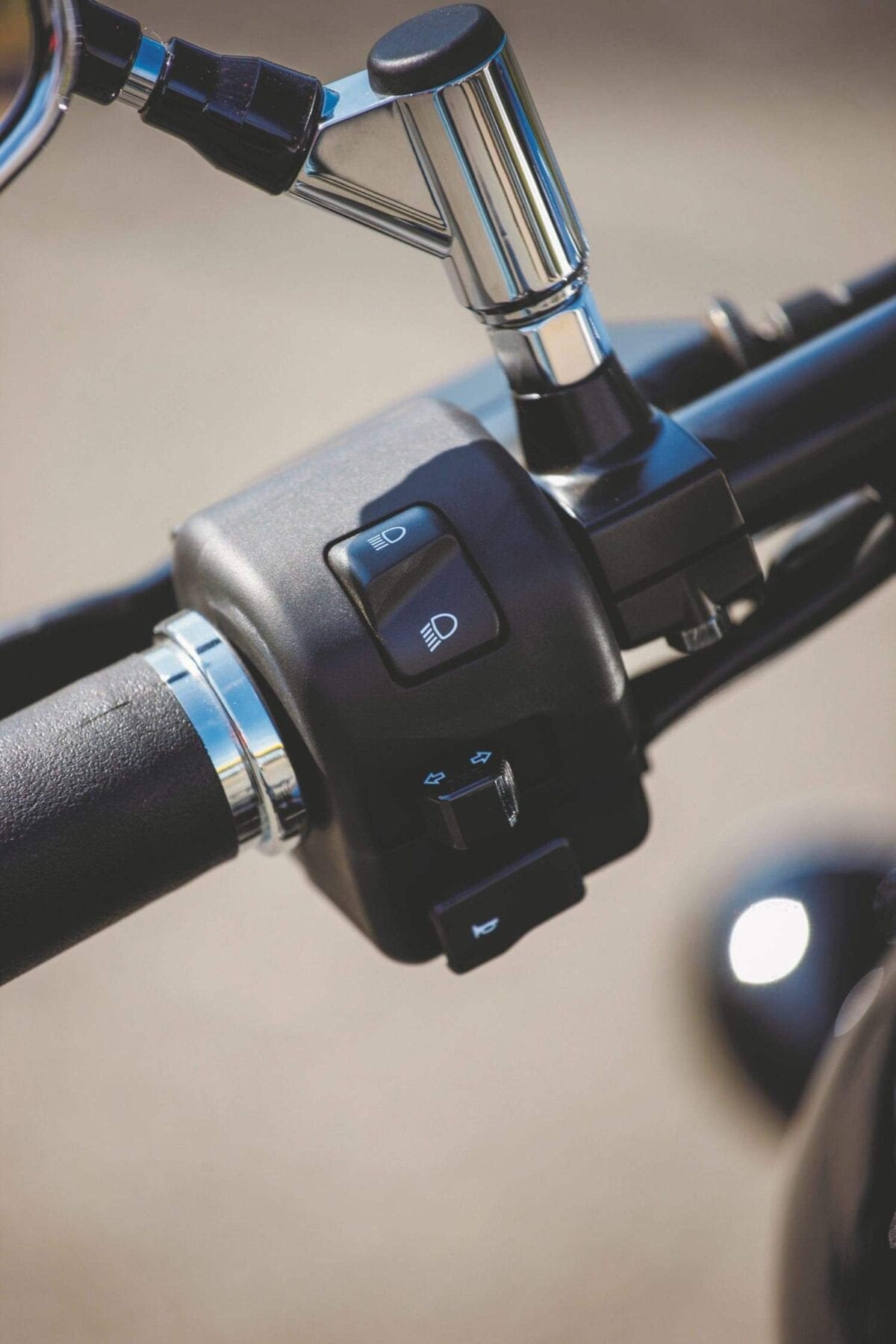 In principle a raked out, low slung motorcycle with a skinny 21-inch front and squat 210-section rear tyre shouldn’t steer this easily, or hold a line through corners like this does. At a standstill, turning around in the road, the bike feels cumbersome, but on the move it’s a piece of cake.