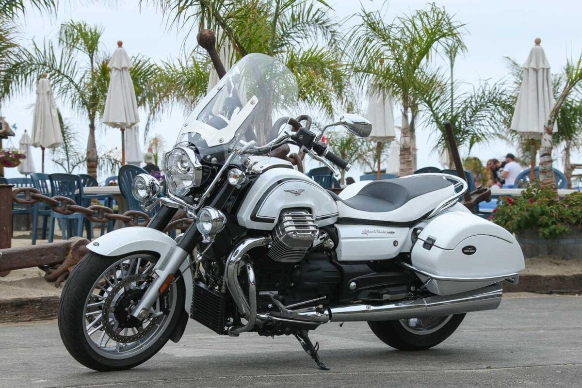 The Touring bike I rode has the neat touches that were seen in the production drawings for the 2014/15 Cali: A funky pillion grabrail; 1950s motorway cop fairing and lights as well as the sweptback panniers. It’s a machine to be seen on, but that doesn’t mean it’s simply for over function.