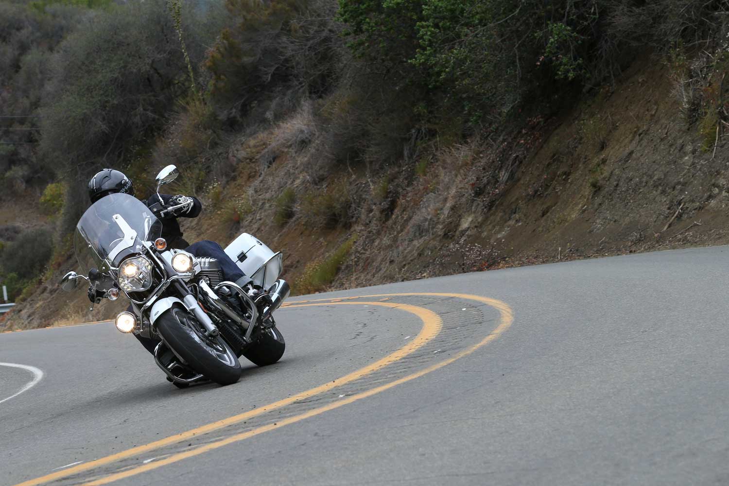 The Cali is a cracking place to be to cover miles as it’s perfectly easy to stick the bike in one gear and roll on and off the power as you need to. It’s also wonderfully manoeuvrable at slow speeds and city-speed too. Even though the fully-dressed and loaded up California tips the scales at a mighty 337kg.