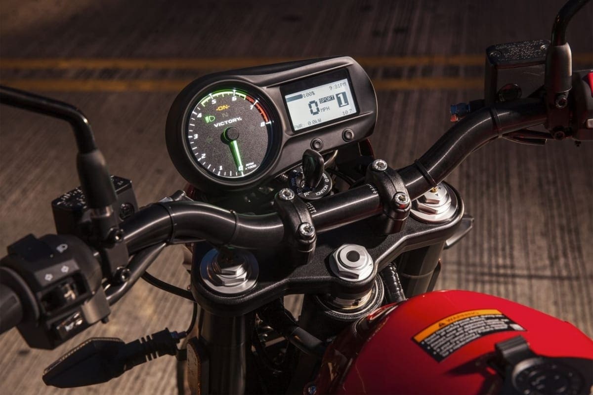 The Victory Empulse TT is capable of top speeds over 100 mph and it has a high-capacity 10.4kWh battery. The bike has a built-in battery charger and an easily accessible SAE J1772 plug atop the bodywork to the front of the seat.