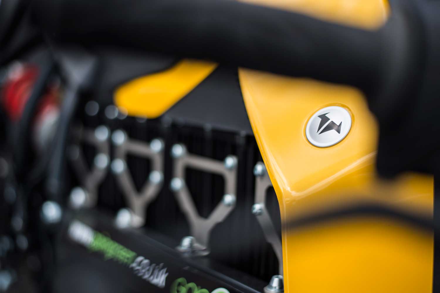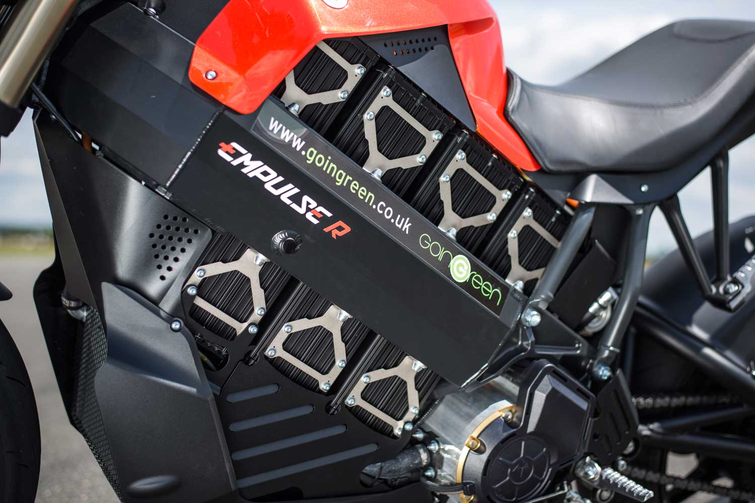 Power is supplied by seven battery ‘modules’ to deliver a total of 104V and 9.3kWh. Each module contains 36 Lithium-ion nickel-cobalt manganese cells. Each of these packs contains its own temperature sensor, plus an over- and under-charge circuit. The cases are aluminium, acting as heatsinks, and offering protection in the event of a crash – it certainly seems no more dangerous than sitting with 16 litres of highly explosive fluid between your legs.