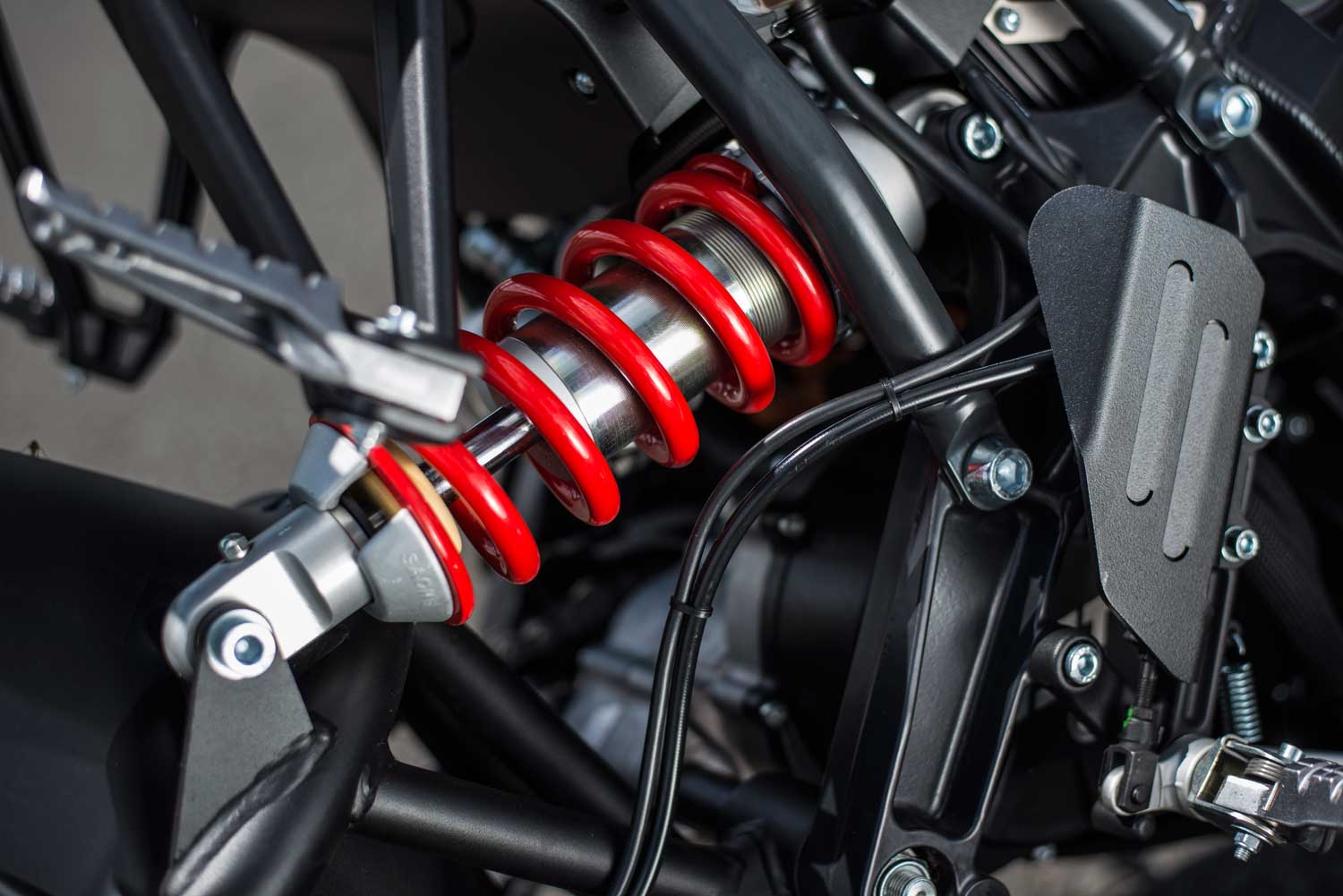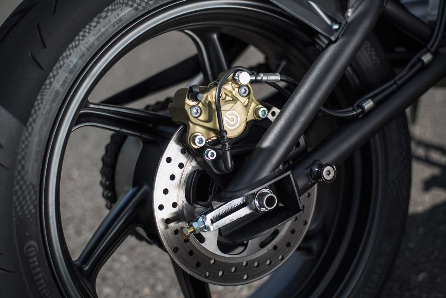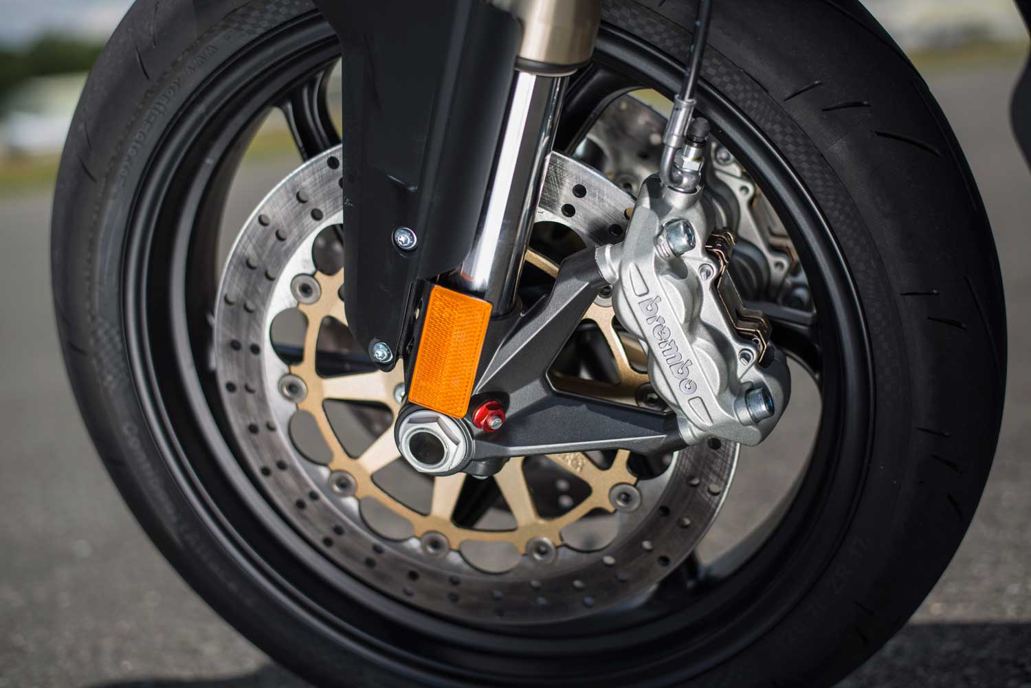 Four-pot Brembo calipers bite on a pair of 310mm front discs, with a dual-piston Brembo unit on a single rear disk.