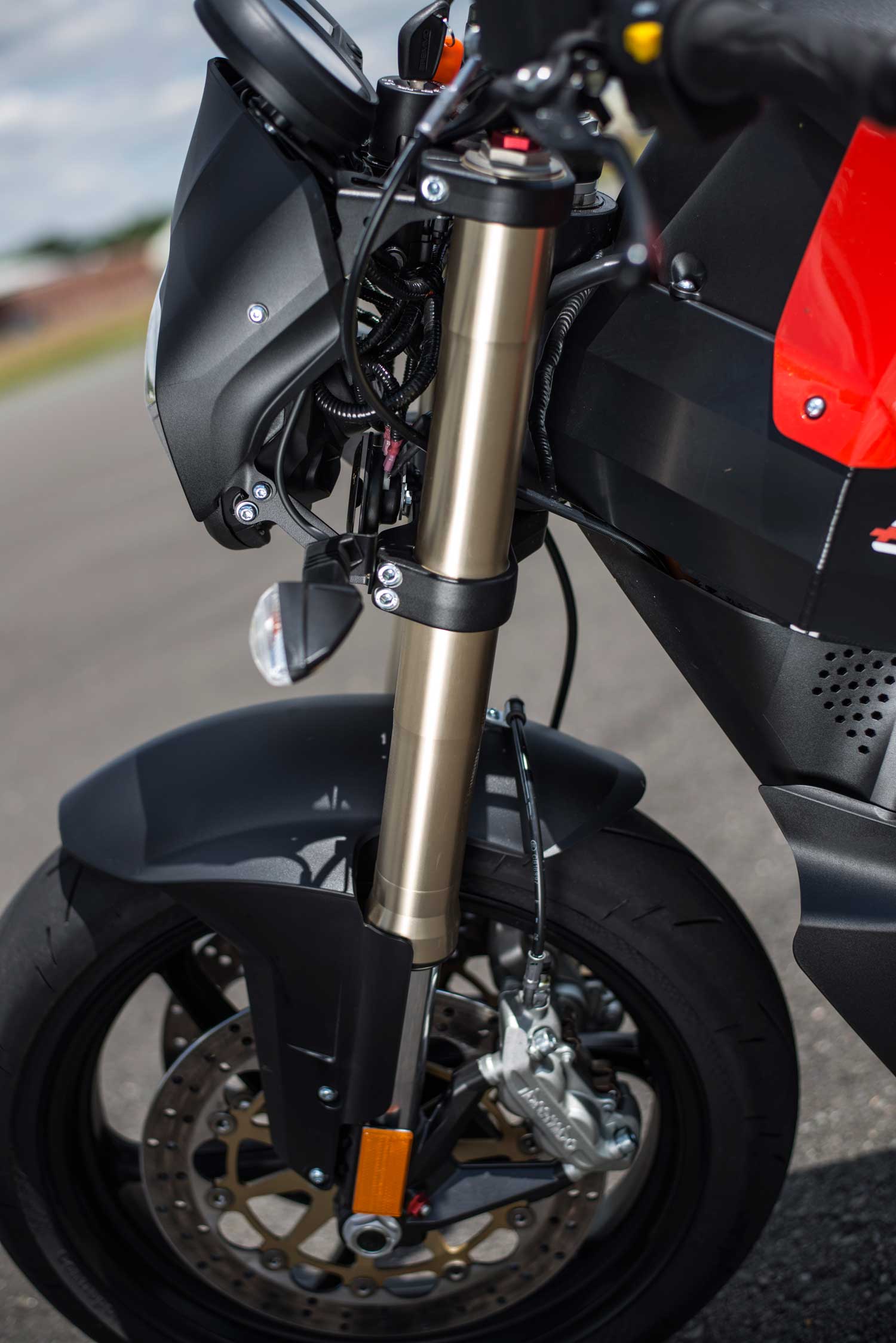 The Brammo Empulse R has an E-beam aluminium frame built by Accossato in Italy (a manufacturer of small-capacity off-road machines in the 70s and 80s, and now offering a range of engineering and welding services), along with a tubular steel sub-frame and swing arm. The bike’s carried on fully adjustable 43mm Marzocchi forks, and an equally tweakable Sachs monoshock.