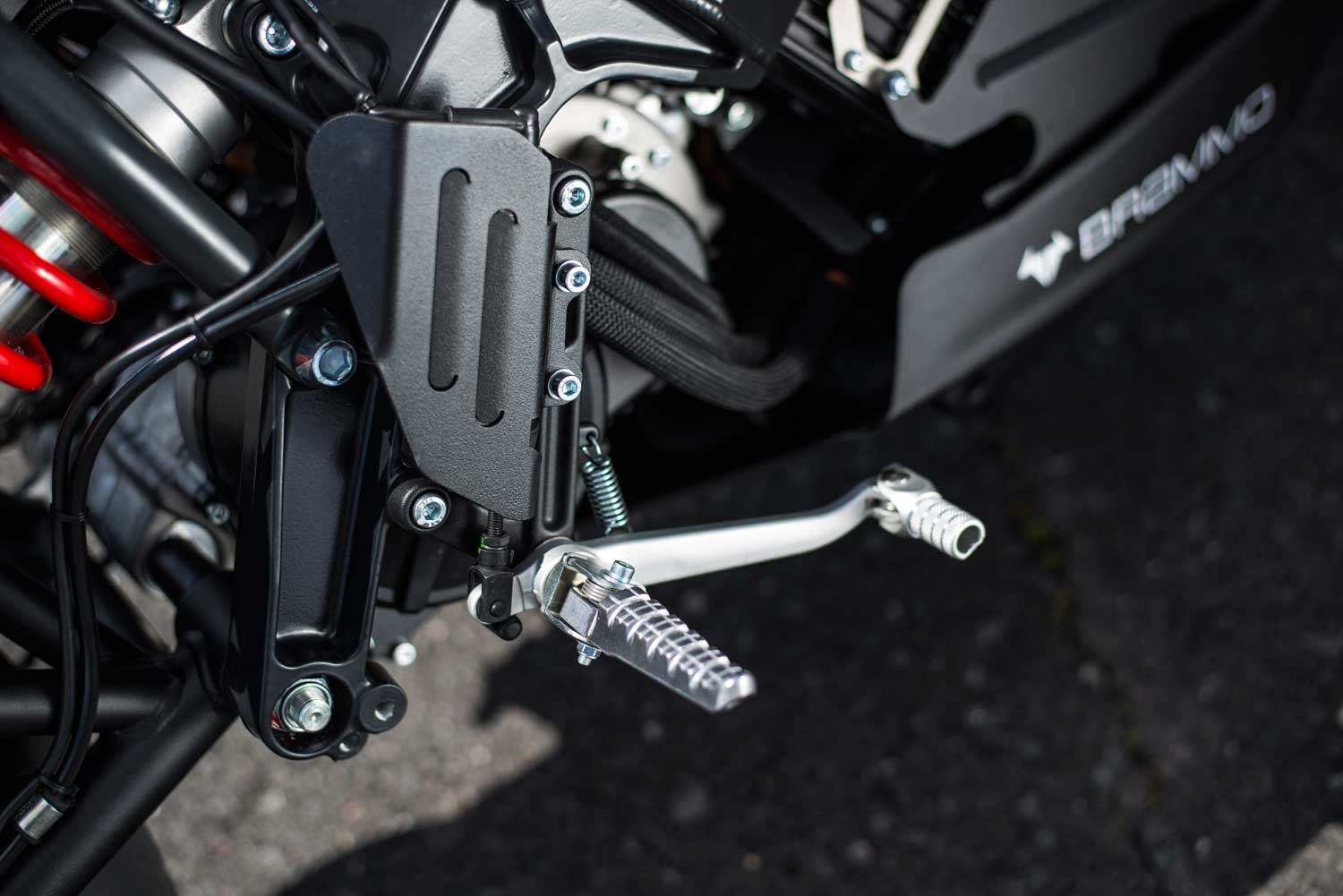 The Brammo uses a water-cooled permanent magnet AC motor, developing 54bhp at 4500rpm. Unusually for electric motorcycles, the Empulse has a six-speed gearbox. Besides allowing the motor to deliver a more efficient performance at all speeds, it also gives the ability to use a smaller, and cheaper motor. The coolant and gearbox oil are the only fluids in the bike, and while the ‘box takes a little longer to warm up than on a ‘normal’ machine (there’s no combustion to warm the transmission oil) this is fairly normal system, though neutral is between 2nd and 3rd (you don’t really need 1st). There’s no need to pull the clutch in before pulling away, and like most bikes, it’s only really needed for downshifts, with clutchless upshifts easy if you just wind off the power for a fraction of a second.