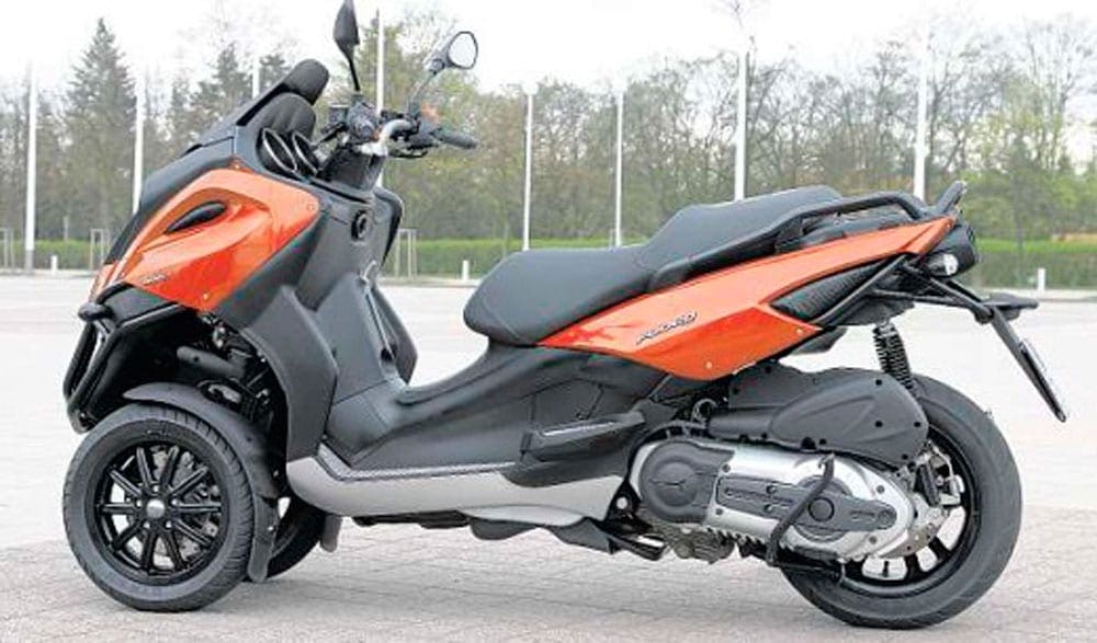 Before we get on to those all important twin front wheels let’s look at the bike’s motivating force. Under those panels lurks a latest generation Piaggio 492cc, twin spark Master engine. It’s an impressive lump – a torquey, water-cooled single with fuel injection and automatic transmission. It has a hefty 244kg load to haul but it still pulls quite well and with no time consuming, rev sapping gears to worry about the power is available on tap. Gilera claim 40hp at 7250rpm and although that’s not breathtaking it will put three digits on the clock.