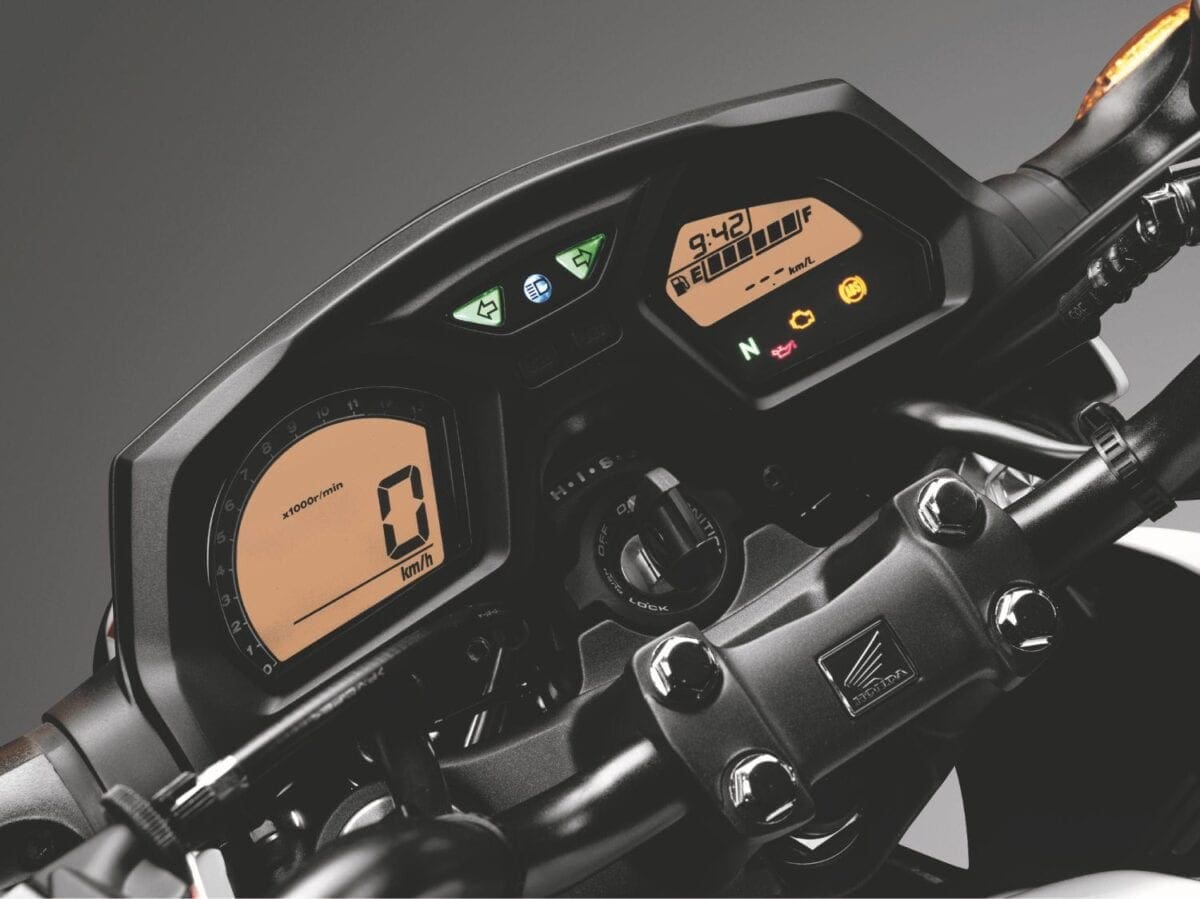 The cockpit’s twin clocks were apparently influenced by the CB’s of old, but what would have traditionally been analogue is now digital on both display faces: the layout is clean and simple, helped by the lack of rider aids to fiddle with.