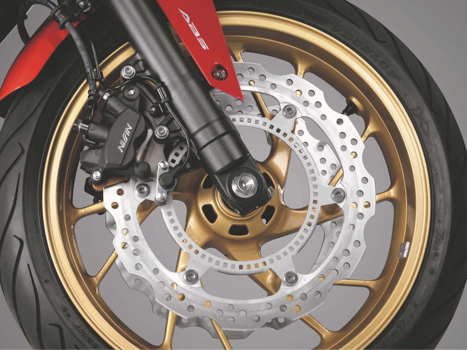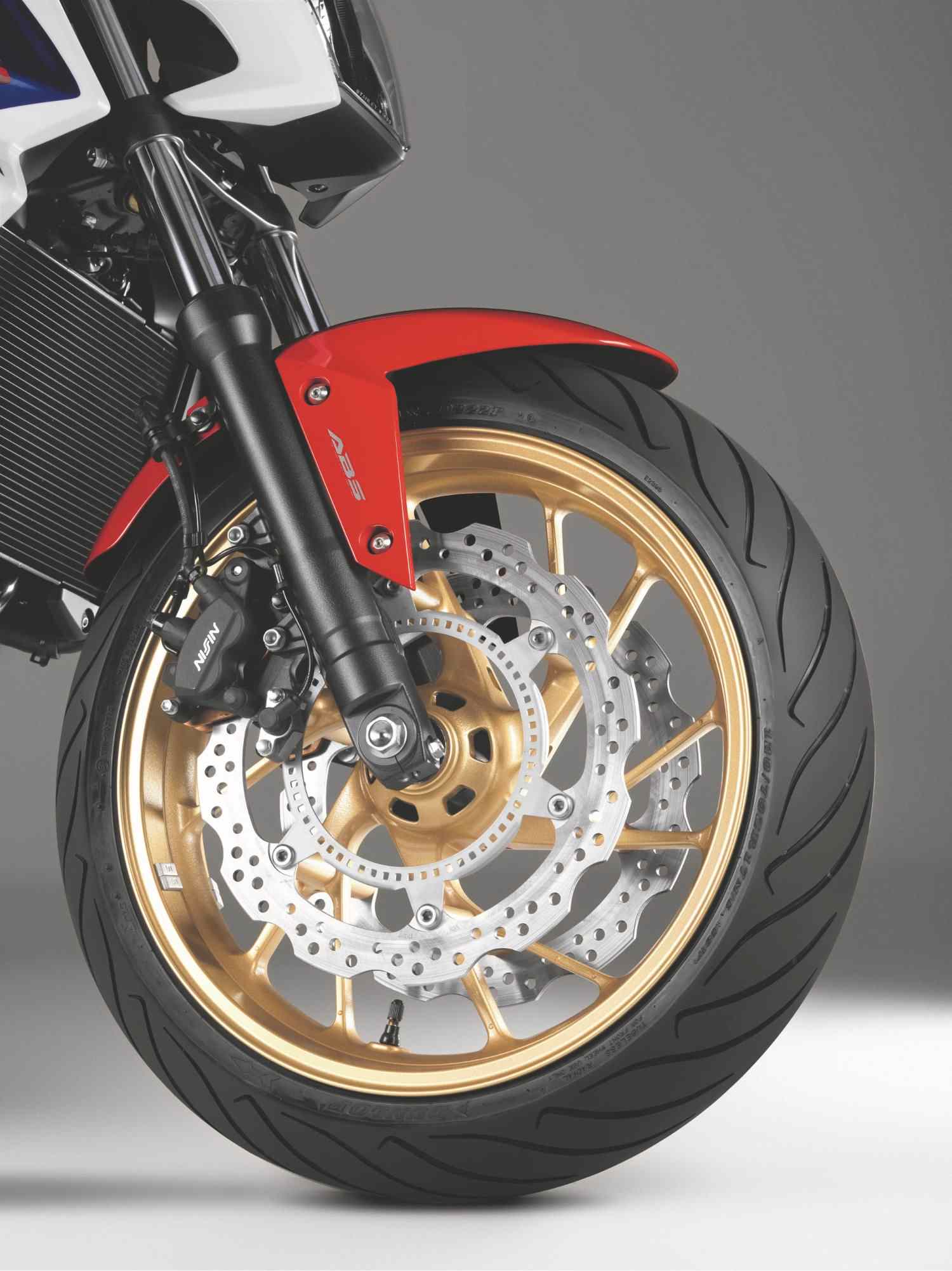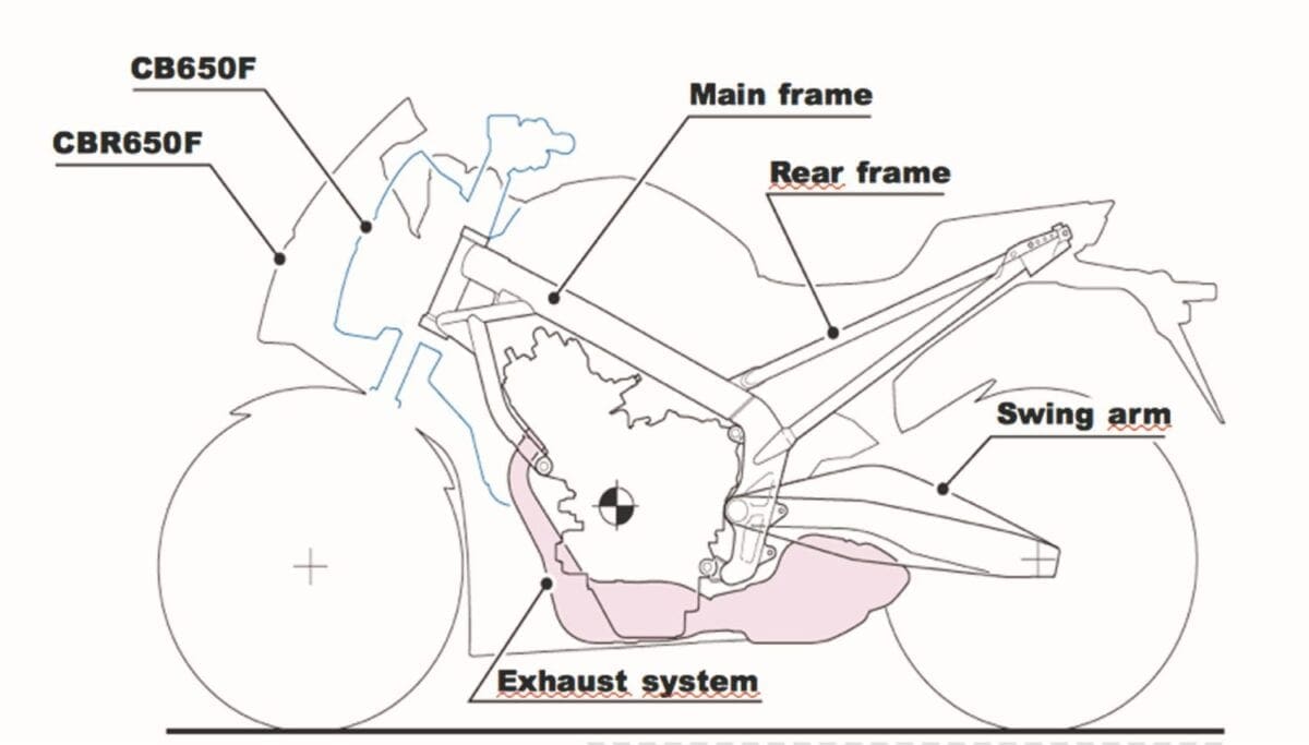 Unlike the CB600 of old, with its hidden backbone-type frame, the new steel chassis is a core feature of the product. Its oval profile – preferred to a cylindrical shape because it’s narrower – is blatant to see and tidily welded to the steel heel plates below it.
