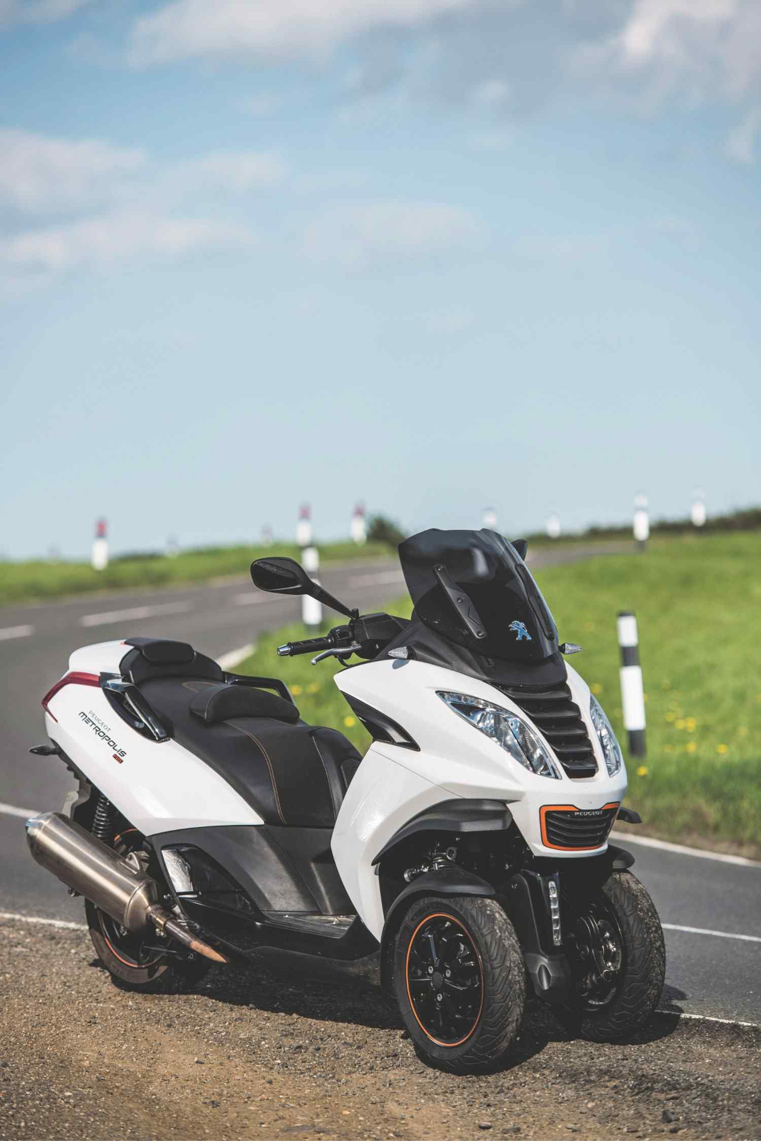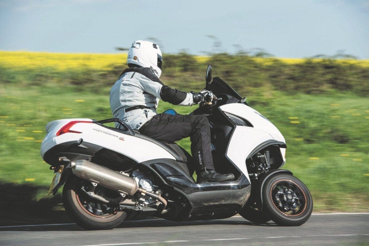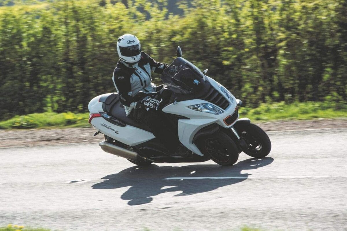 D80_2865Whether filtering through busy traffic, zipping down the motorway, or enjoying some sweeping back-roads, the Metropolis is nimble and secure. Pot holes offer the only real problem, as the small wheels give a very ‘crashy’ ride that can get uncomfortable on the worst routes. This is the case on all scooters, but it’s made worse with a three-wheeler, which has a better chance of finding those ruts.