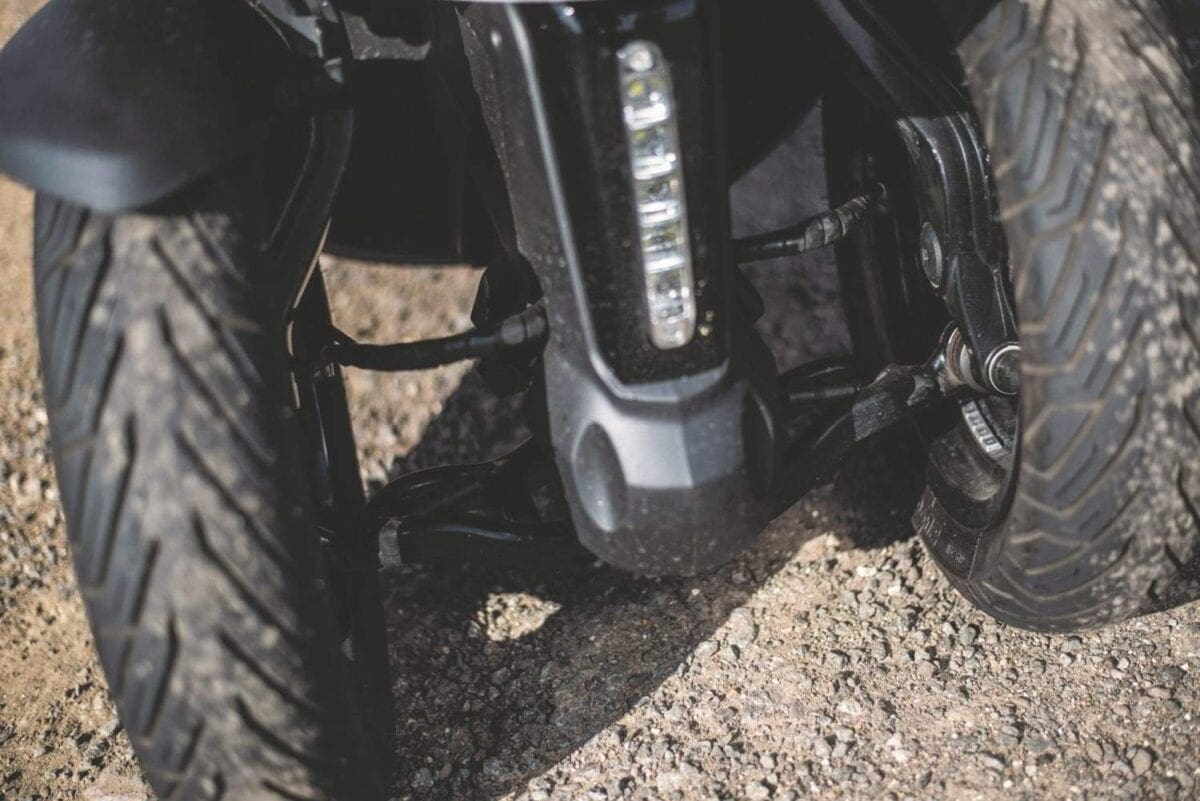 The extra wheel makes for a confidence-inspiring ride, particularly on wet, greasy or dusty roads. Ideal for new riders, it’s not impossible to crash, but the front can’t tuck like a traditional two-wheeler. There’s no ABS, but you have to try hard to lock the wheels up, and even then, I’ve only managed a very controlled squeal from the back, so there’s no need for the extra D80_2801weight the system would bring to a scooter that’s more portly than most motorcycles.