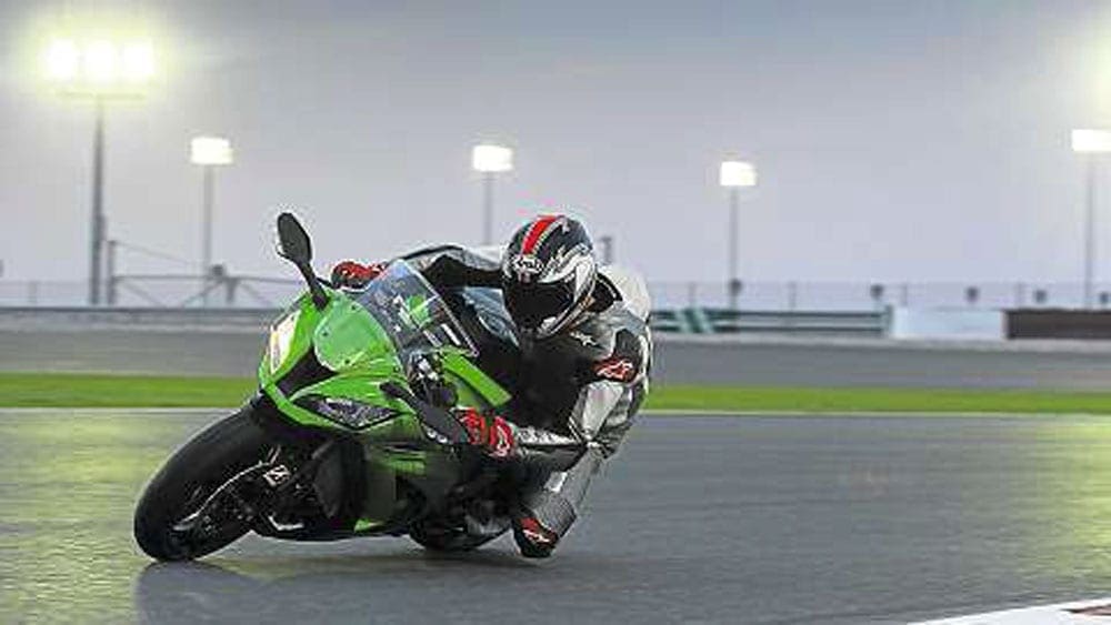 The ABS is exceptionally smooth, as it doesn’t simply monitor wheel deceleration, like most do, it also looks at front brake hydraulic pressure, throttle position, revs and even the clutch and gear positions, the first system ever to involve communication between the engine and ABS ECU computers. So instead of the lever vibrating nastily in your hands as the limit of grip is reached, it pulses more gently, letting you maintain control and modulate the stopping. Again, this enhances control rather than taking it away. At the bike’s riding launch in Qatar, on the floodlit Losail circuit, this meant pushing the bike not just hard, but consistently hard, even after the sun had gone down and there was an increased chance of moisture forming on the track. The track isn’t so demanding in some respects though, with only one place where the Ninja was being flicked side to side hard, and with a smooth surface that bears little resemblance to the typical bumpy British back road.