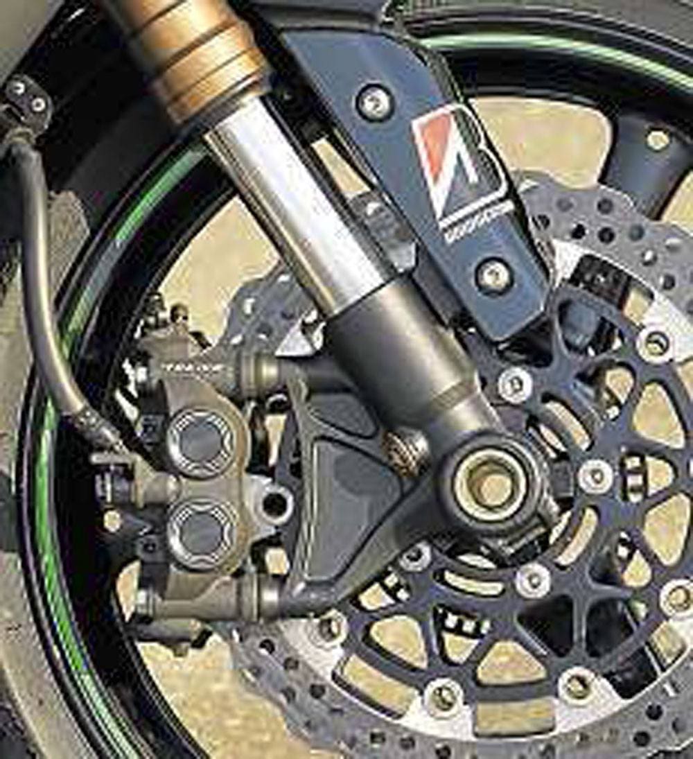 Brakes: Front: Dual radial-mount, opposed 4- (aluminium) piston calipers, with dual semi-floating 310mm petal discs. Rear: singlebore pin-slide, aluminium piston caliper with single 220mm petal disc