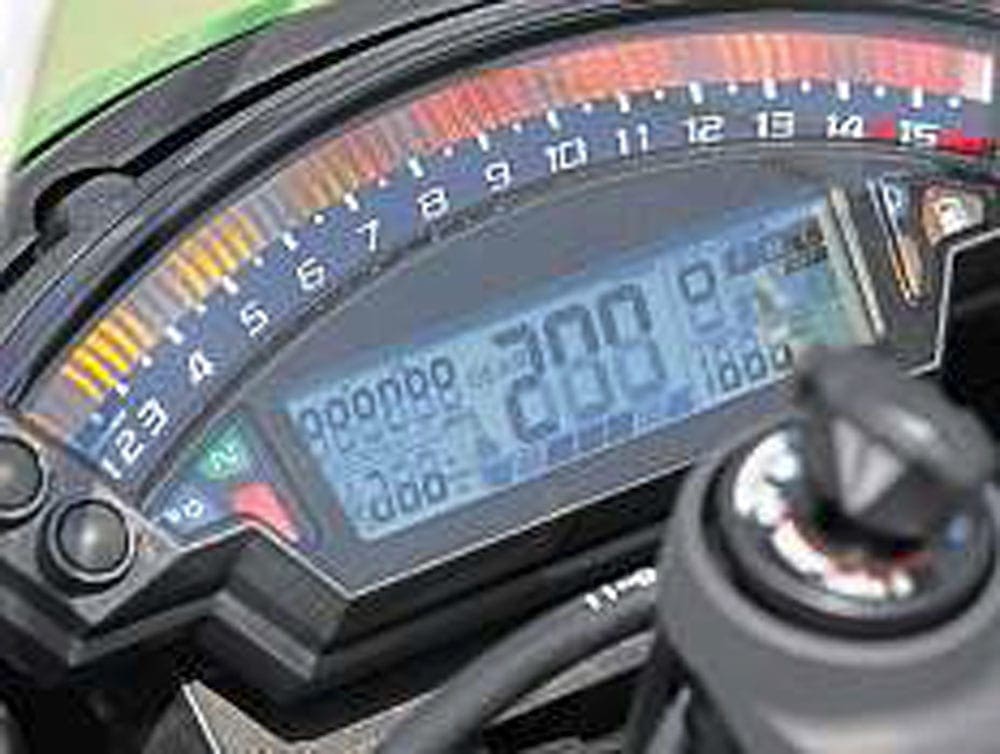So far, so good: that’s all the kind of stuff we’re used to reading about new sportbikes: less weight, more power, better driveability, job done. But Ducati, BMW and Aprilia have moved the goalposts in the last couple of years, embellishing their bikes with electronic systems the Japanese had been showing no obvious interest in. This newest Ninja is the first Far Eastern machine to hit back, endowed as it is with what is probably the most advanced traction control system yet, called S-KTRC. This looks at the difference between front and rear wheel speeds, engine rpm, acceleration and throttle position and decides if the rear tyre is spinning, then it deals with excess power that might make the spin excessive – ie you fall off – by interrupting the ignition spark. And it’s evenmore complex than it sounds, learning from what you’ve done before to predict when it might encounter spin again, rechecking the situation every fivemilliseconds.