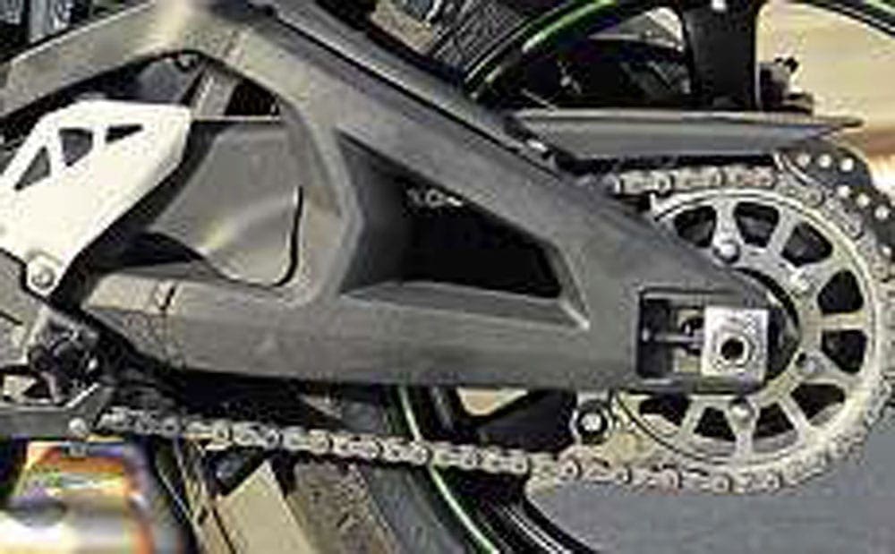 Not quite so conventional with the Swingarm though: where most designers go for the longest possible, Kawasaki says a compromise needs to be struck between the traction you get from long swingarm and the better feedback from making it a little shorter. Either way, it’s a beautiful and complex construction, and it has enough chain adjustment to remove two links for a 16mm shorter wheelbase, recommended only for track use. The increase in weight distributed over the front wheel has allowed slightly more radical front end geometry, while the rear shock is now laid out horizontally above the swingarm pivot, keeping it well clear of the exhaust chamber beneath the bike and helping further with mass centralisation.