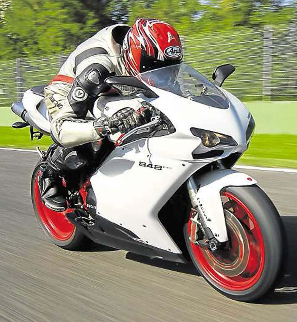 Climbing across the bike after that right-hander and then getting it stopped on the steep downhill section into Rivazza was always a challenge, made easier by the power of the monobloc calipers. In a way that front brake sums up the way the 848 has evolved. The monobloc calipers give huge power; 20% more deceleration for the same lever pressure, according to Ducati. On the dry track that was welcome, but some riders find the monoblocs a bit too much, especially for road use.