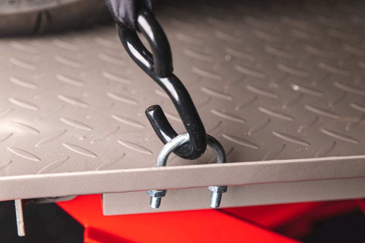 Able to take a huge 450kg in safety, the lift is plenty long and wide enough for almost any motorcycle you can think of. A front wheel clamp and four metal hoops make securing the bike easy, even single-handedly.